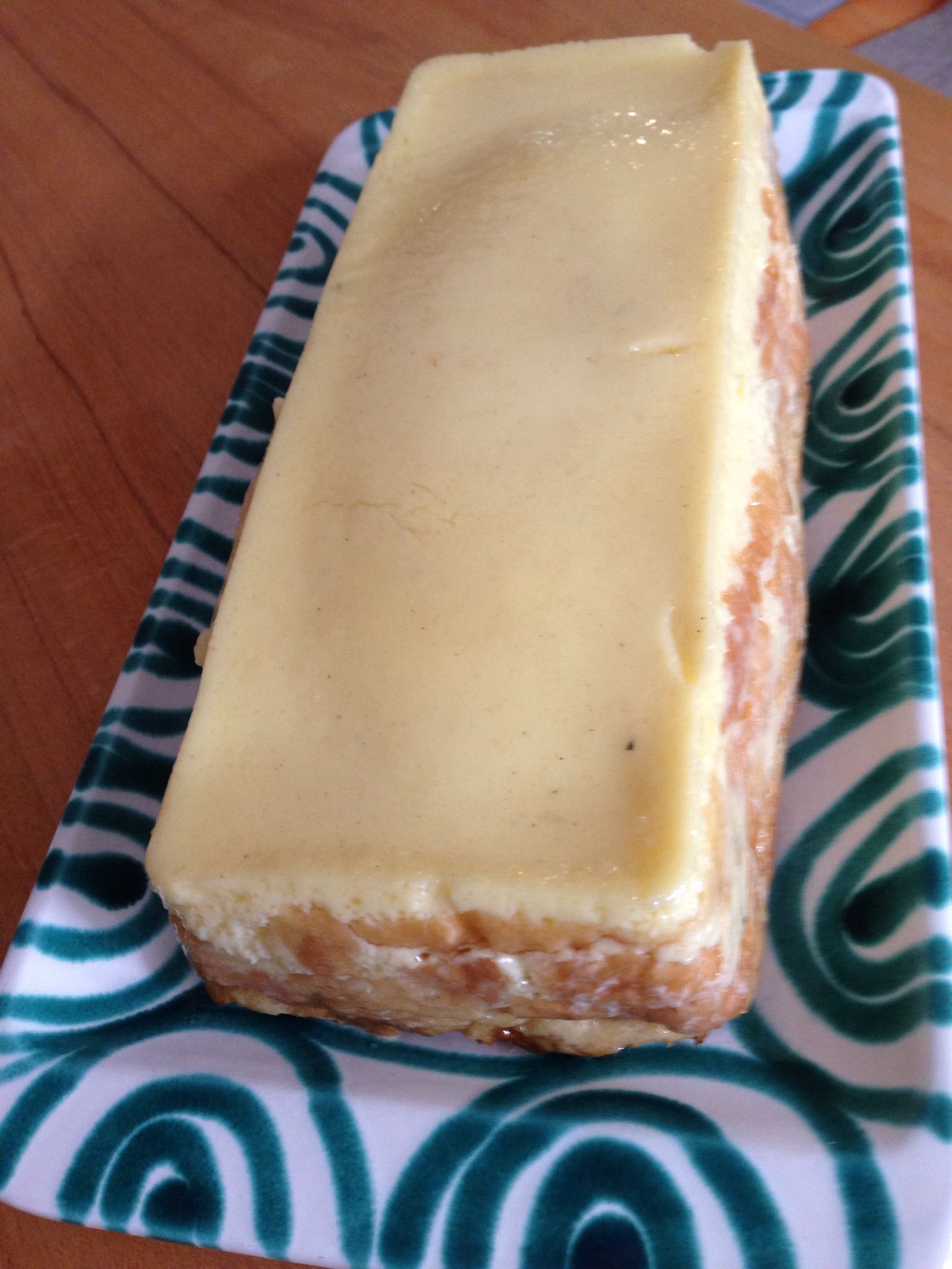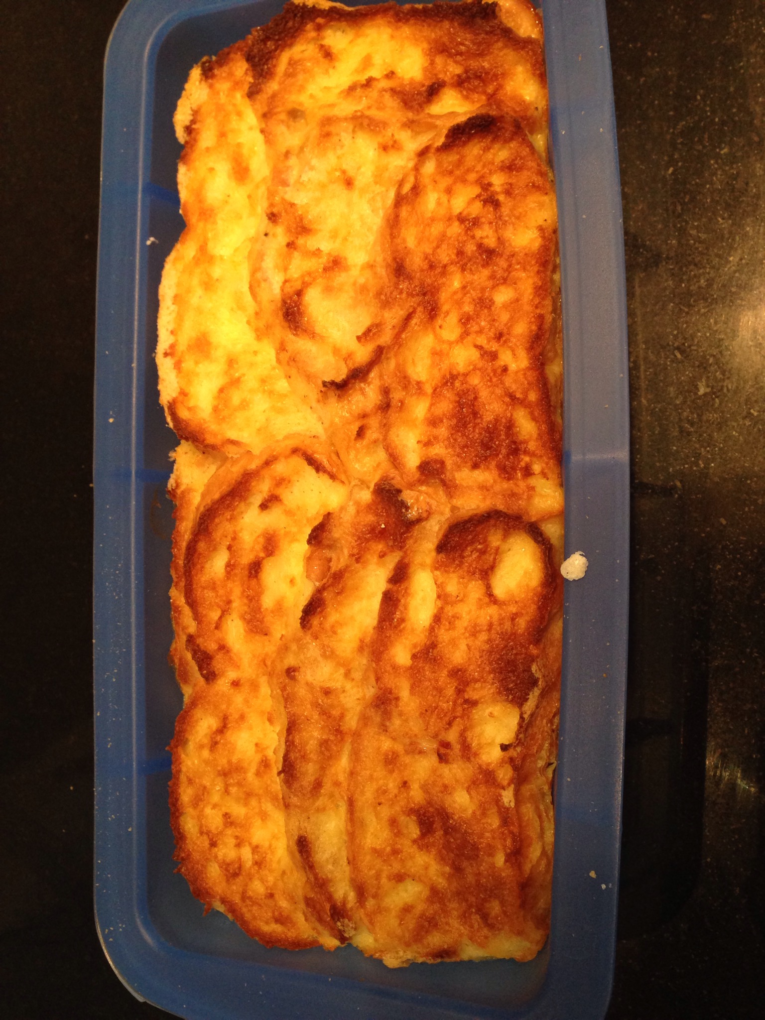 Man vermischt 0,6 l Milch, 6 Eier und 200 g Zucker, gibt etwas Zimt und Zitronenschale dazu. Mit 50 g Zucker macht man mit wenig Wasser ein Karamell, das man in eine Backform gießt. Man schichtet die einzelnen Brotscheiben darauf und gießt nach und nach das Milchgemisch dazu.