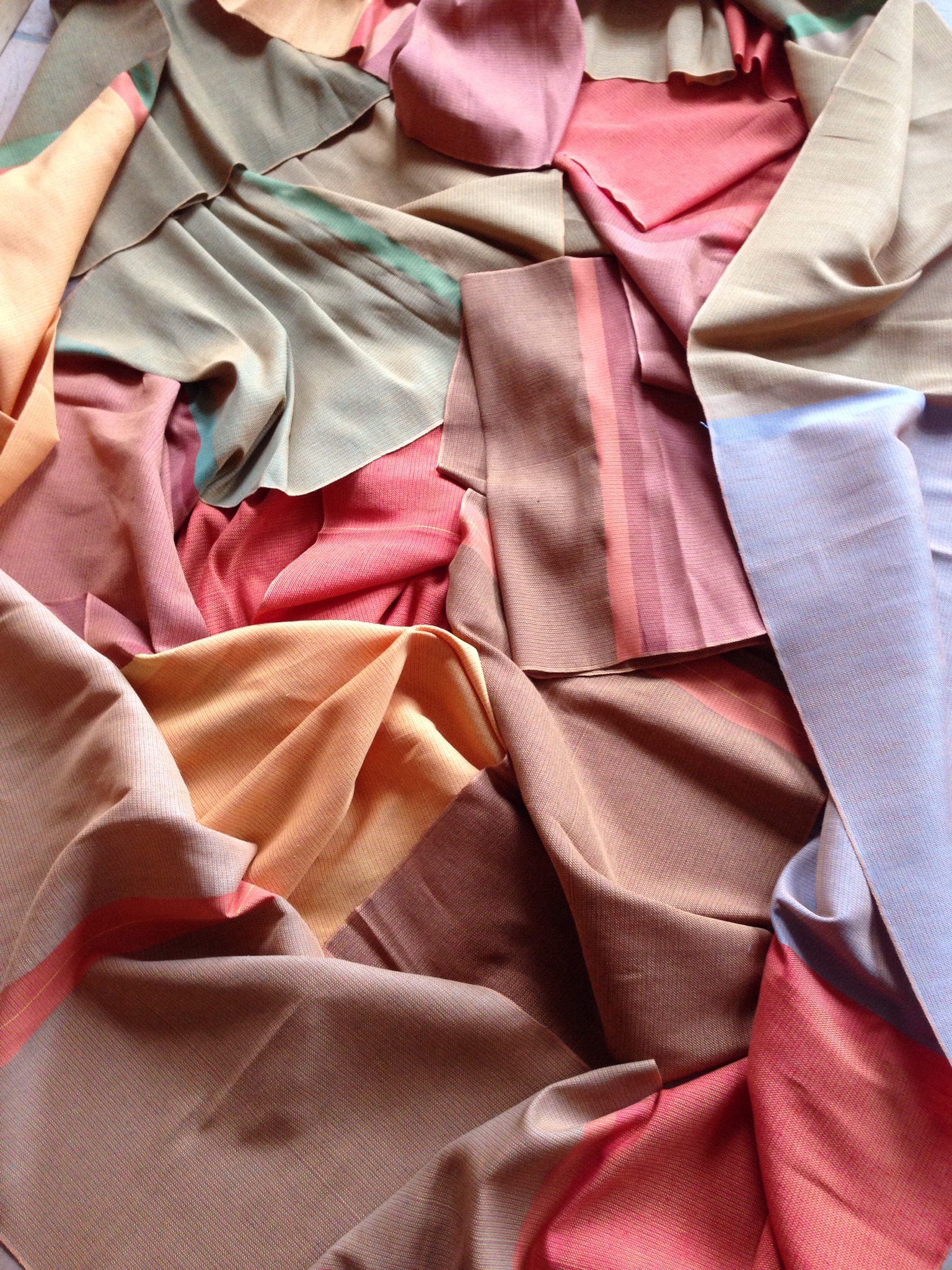 Ich habe das Geschirrtuchgewebe, nachdem ich es vom Webstuhl genommen hatte, eine Nacht lang eingerollt und in der Badewanne eingeweicht, damit sich nur ja keine Falten bilden.