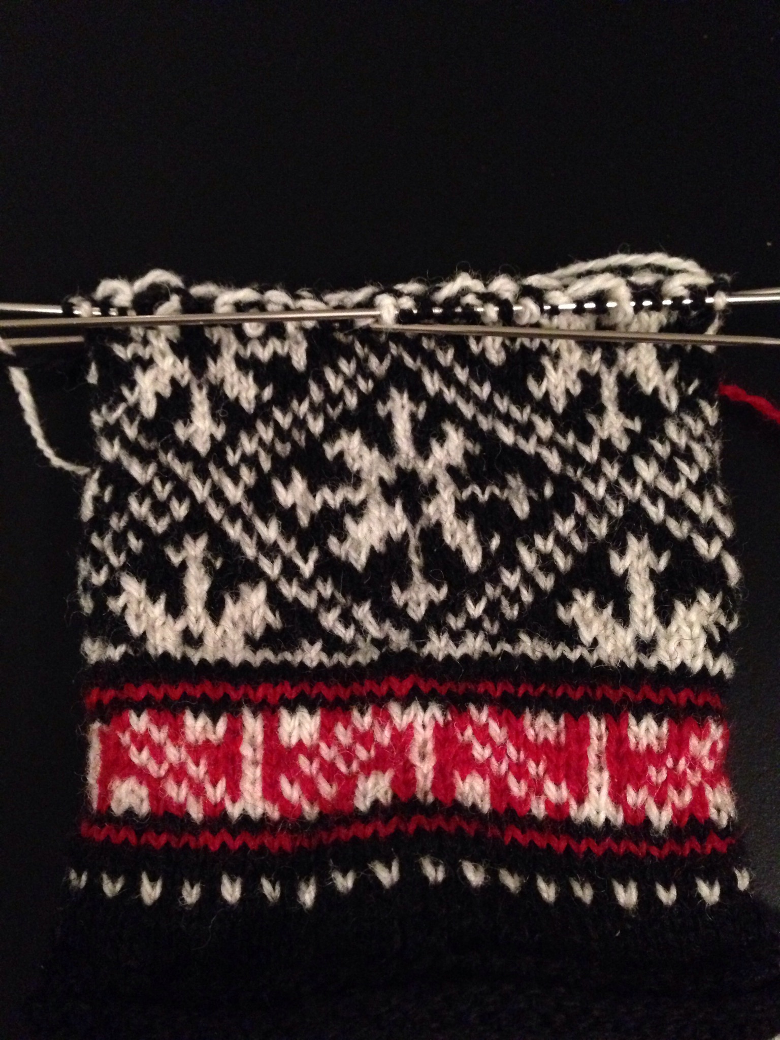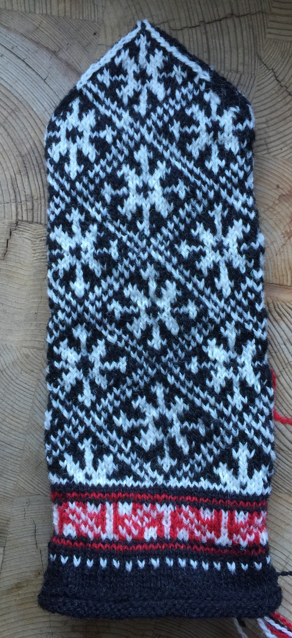 Bis auf den Daumen ist der erste Handschuh fertig. Ich glaube, ich werde die Daumen bei beiden Handschuhen erst am Ende stricken. Schön ist er schon, finde ich.