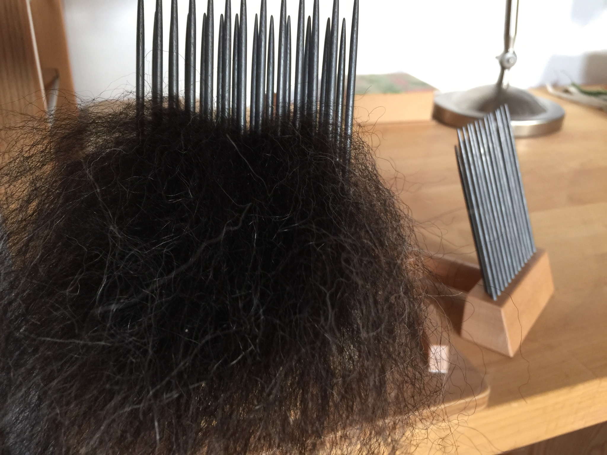 Die andere Hälfte der Wolle bearbeite ich mit den Wollkämmen: