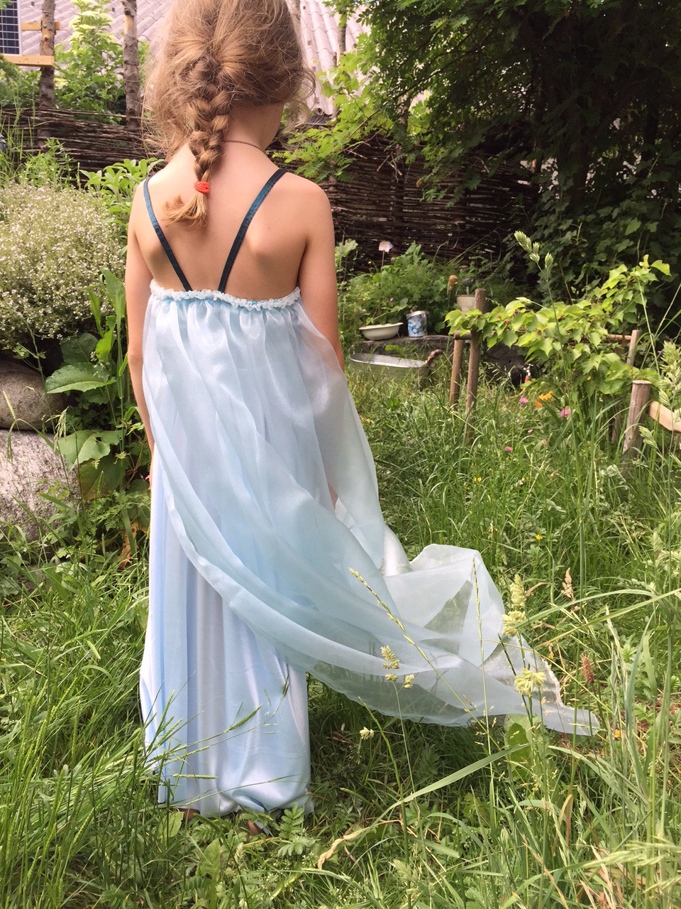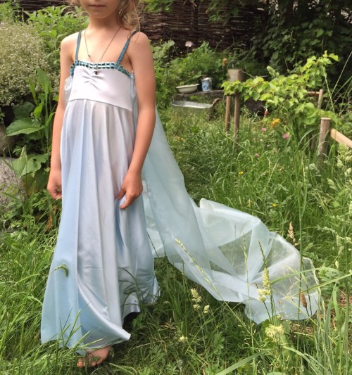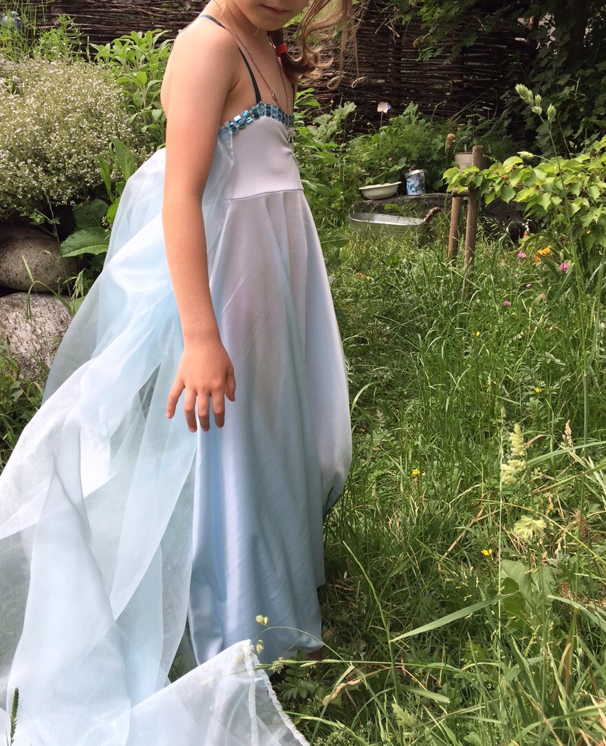 aus der Eiskönigin habe ich heute für meine 6-jährige Enkelin genäht. Sie hat vor ein paar Wochen in dem Musical als Schneeflocke mitgetanzt. Jetzt wollte sie gerne Elsa sein. Die Mutter hat die Stoffe gekauft, die Großmutter hat genäht und das Kind war glücklich.