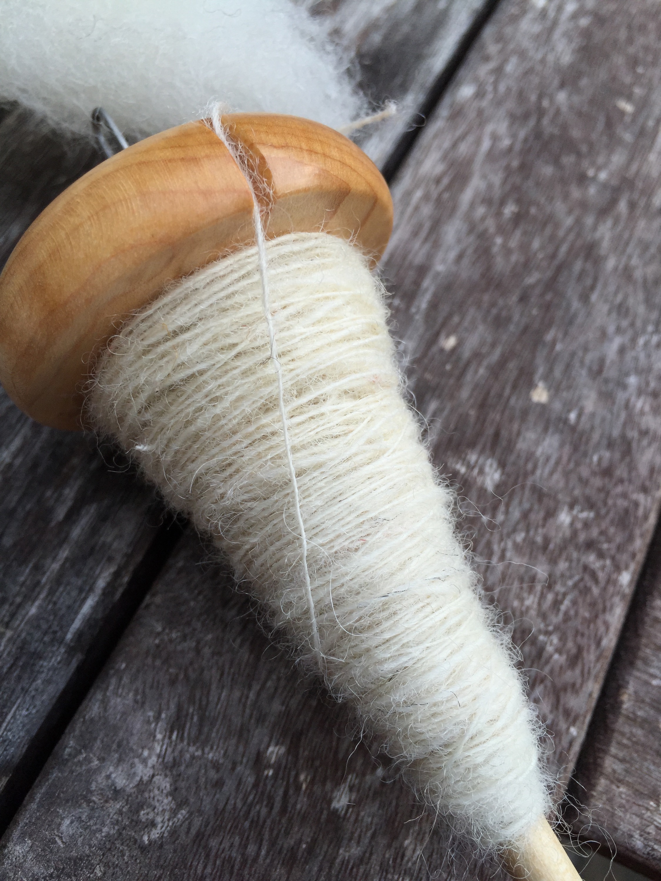 Ich spinne Tiroler Bergschaf, das ich zweifädig verzwirne – gerne auch auf der Handspindel, irgendwann einmal färbe und dann ein Tuch daraus stricke.
