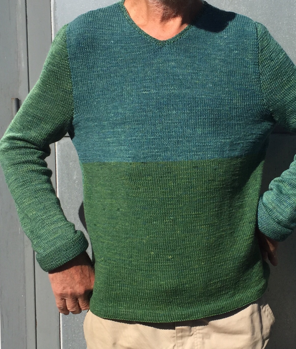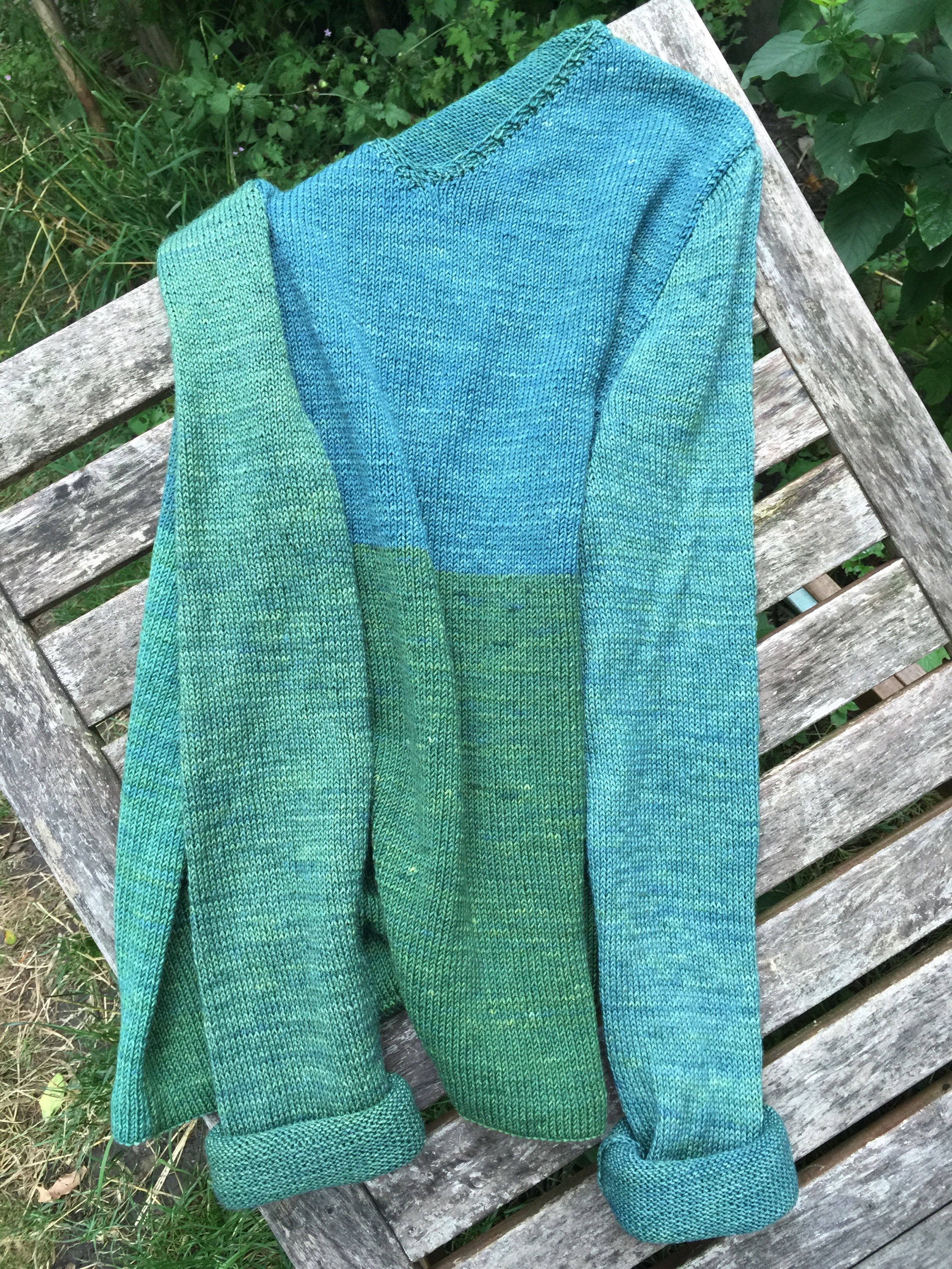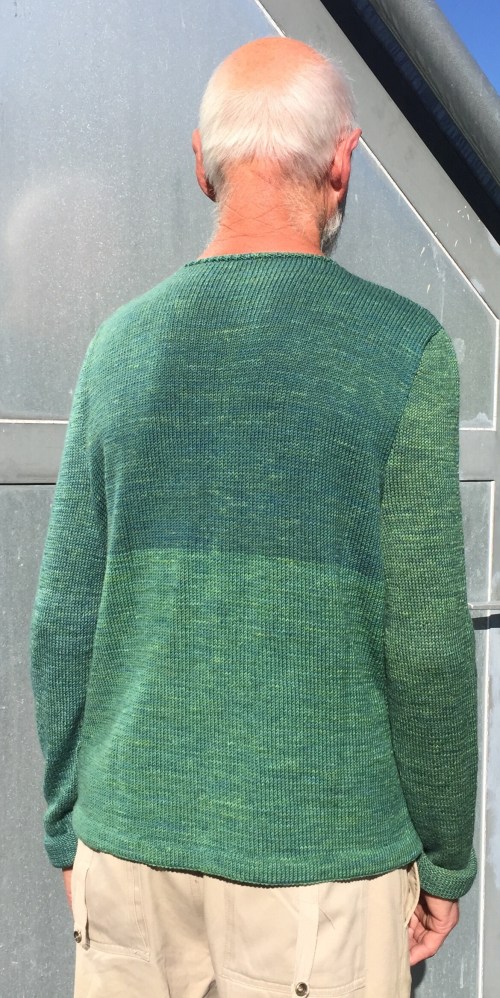 Jetzt ist er fertig. Die Färbungen (gelb mit verschiedenen Pflanzen, dann mit Indigo überfärbt) sind hübsch, das Material (reine Wolle) ist sehr angenehm zu tragen, auch die Ärmel, die ich aus einem dünneren Garn (Wolle, Bambus, Seide) gestrickt habe, fügen sich gut ein.