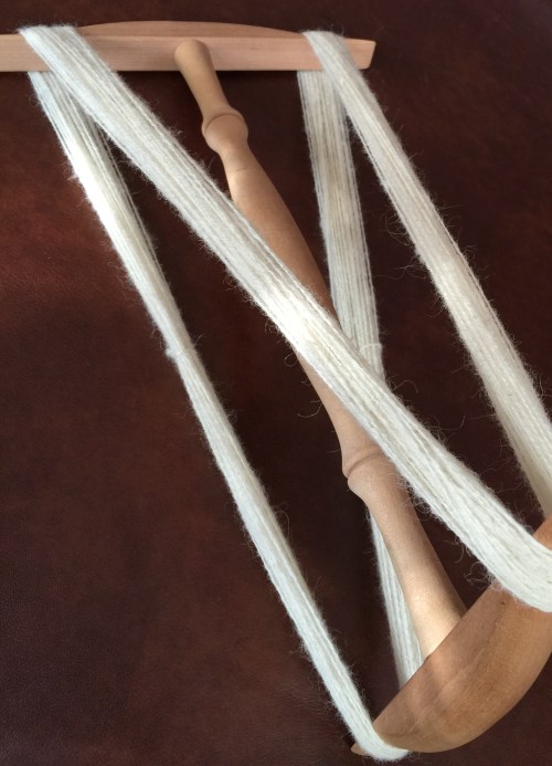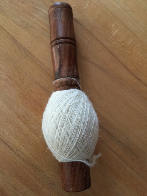Wenn die Spindel voll ist, wickle ich das Garn auf einen Stab, achte allerdings darauf, dass der Garnanfang nicht mit eingewickelt wird.