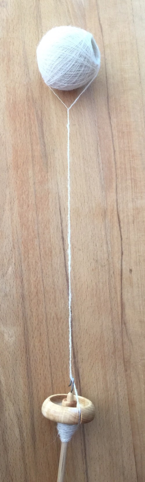 Nun knote ich Anfang und Ende des Fadens zusammen und befestige ihn an der Handspindel. Jetzt kann ich die beiden Fäden verzwirnen, indem ich die Handspindel in die entgegengesetzte Richtung drehe, in der ich den Einzelfaden versponnen habe.