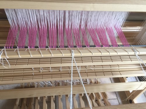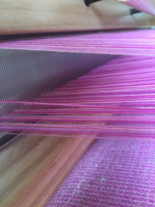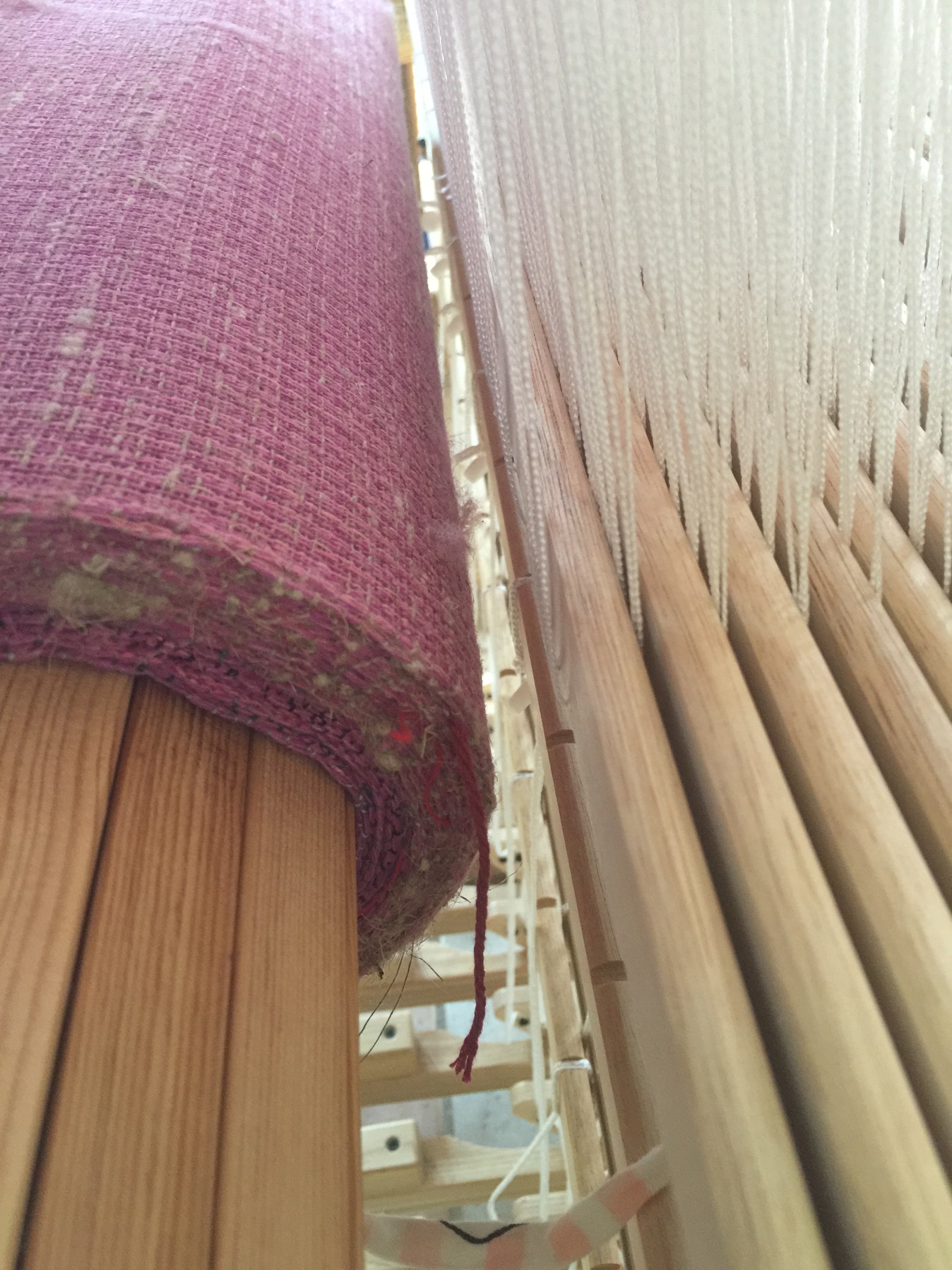 Vorteil beim Louët Delta: Es gibt sehr, sehr wenig Kettabfall. Es ist gut möglich, bis fast ganz an’s Ende der Kette zu weben – das Fach, das sich bildet, ist immer noch groß genug, um das Schiffchen durchzuschießen.