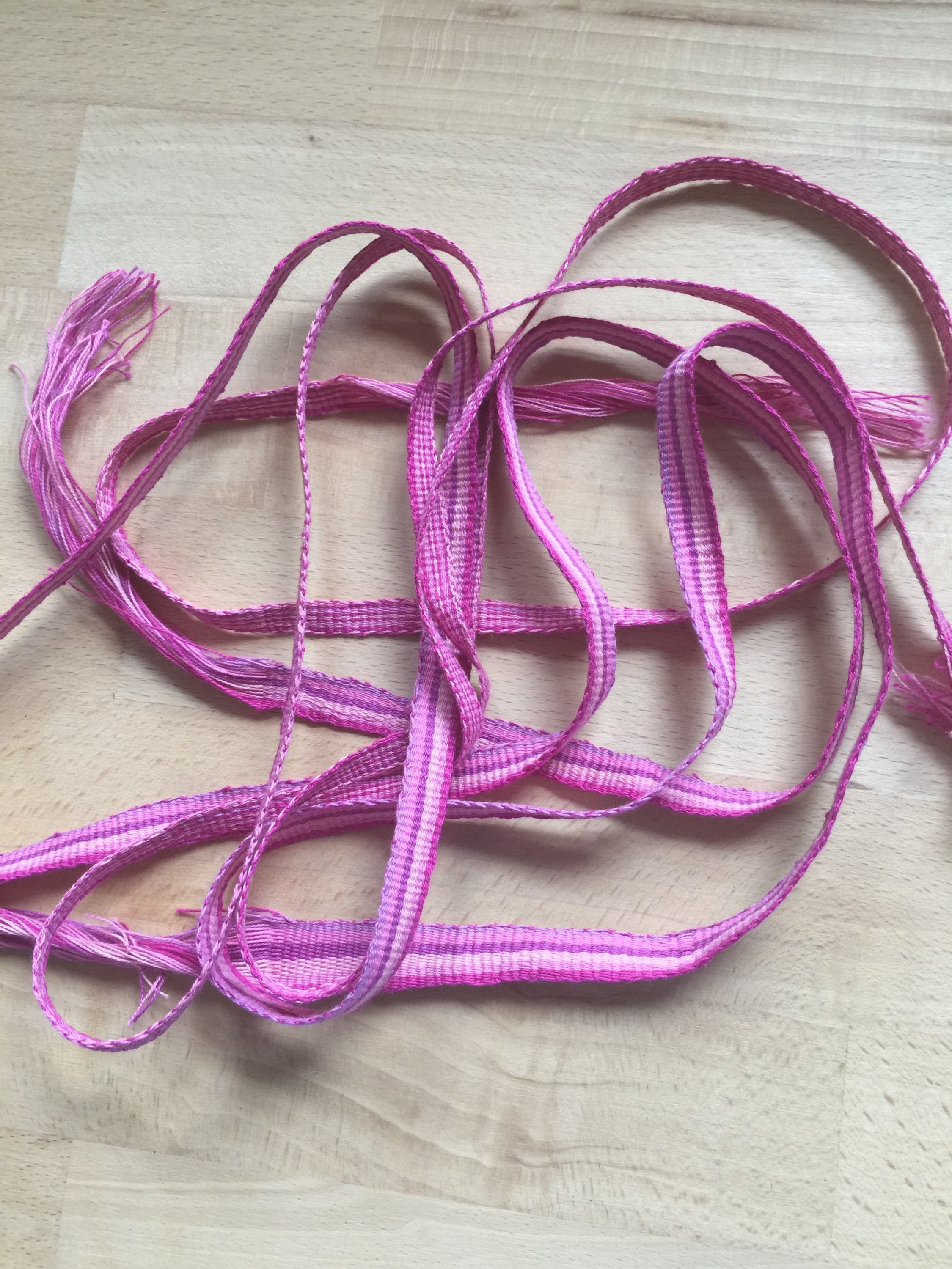 Jetzt geht’s an’s Säumen und Aufhänger Annähen, die ich schon vor langer Zeit mit dem Bandwebgerät gewoben habe.