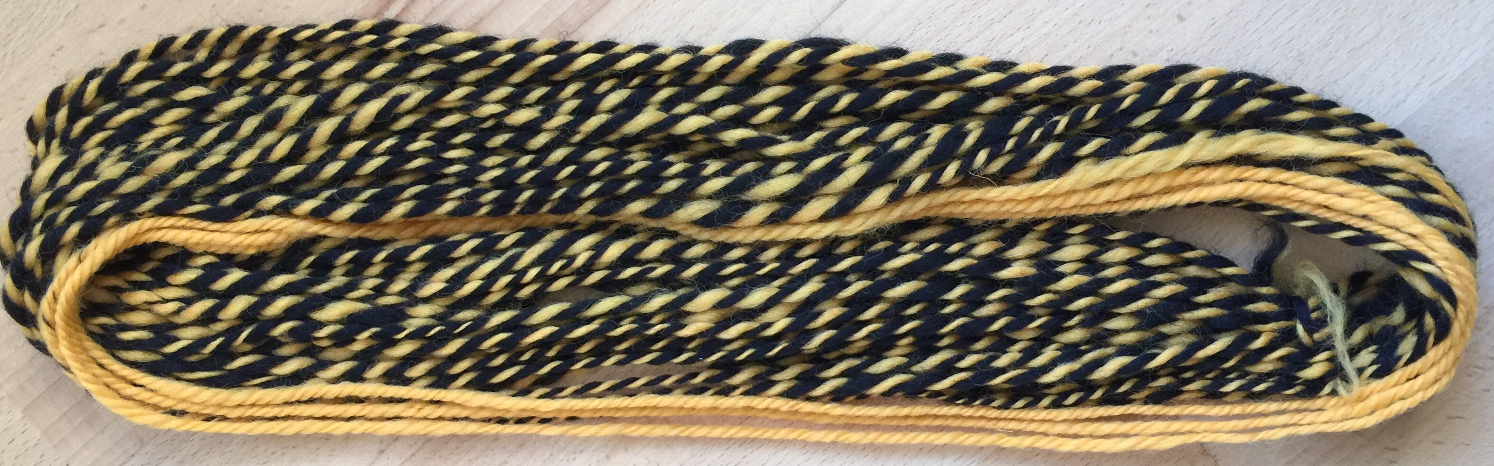 Nachdem ich mich nun wieder intensiver damit beschäftigt habe, ist es mir doch wieder gelungen, ein etwas dickeres Garn zu spinnen. Für die Probe habe ich zwei kontrastierende Farben genommen (um die Struktur besser sehen zu können), die ich dann zweifach verzwirnt habe. Den Rest des gelben Garns habe ich dann noch navajo gezwirnt.