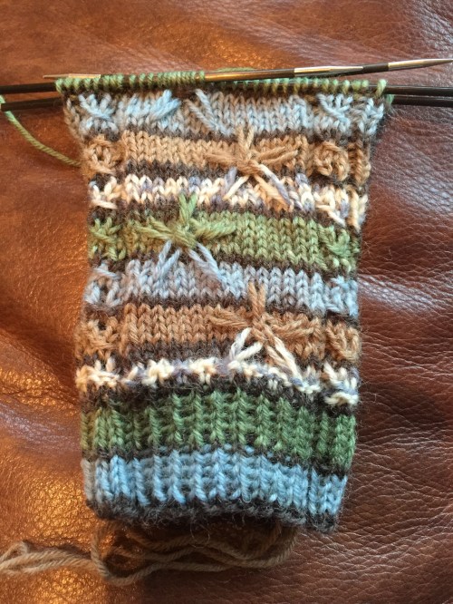 So heißen die Socken, die ich gestern zu stricken begonnen habe. Mir gefallen die Blümchen so gut – sie befinden sich nur auf der Oberseite. Rechts und links davon gibt’s einen „falschen Zopf“, die Rückseite ist gerippt.
