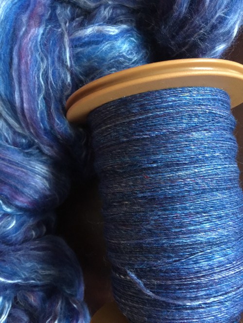 Ich habe mich dafür entschieden, die blaue Merino- Sojaseidenmischung zu einem zweifach gezwirnten Lacegarn zu verspinnen.