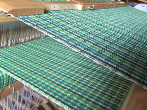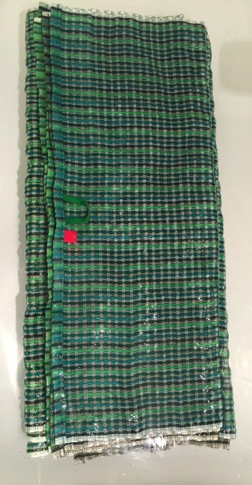 Nun sind meine gewobenen Handtücher (Bindungsentwurf von Winnie Poulsen) fertig getrocknet und gemangelt. Ich bin ganz zufrieden damit. Man sieht auch recht gut die Kreise, die durch die Art der Bindung und der Verwendung unterschiedlicher Materialien (Leinen und Baumwolle) entstanden sind – Flottierungen, die sich durch’s Waschen zusammenziehen.