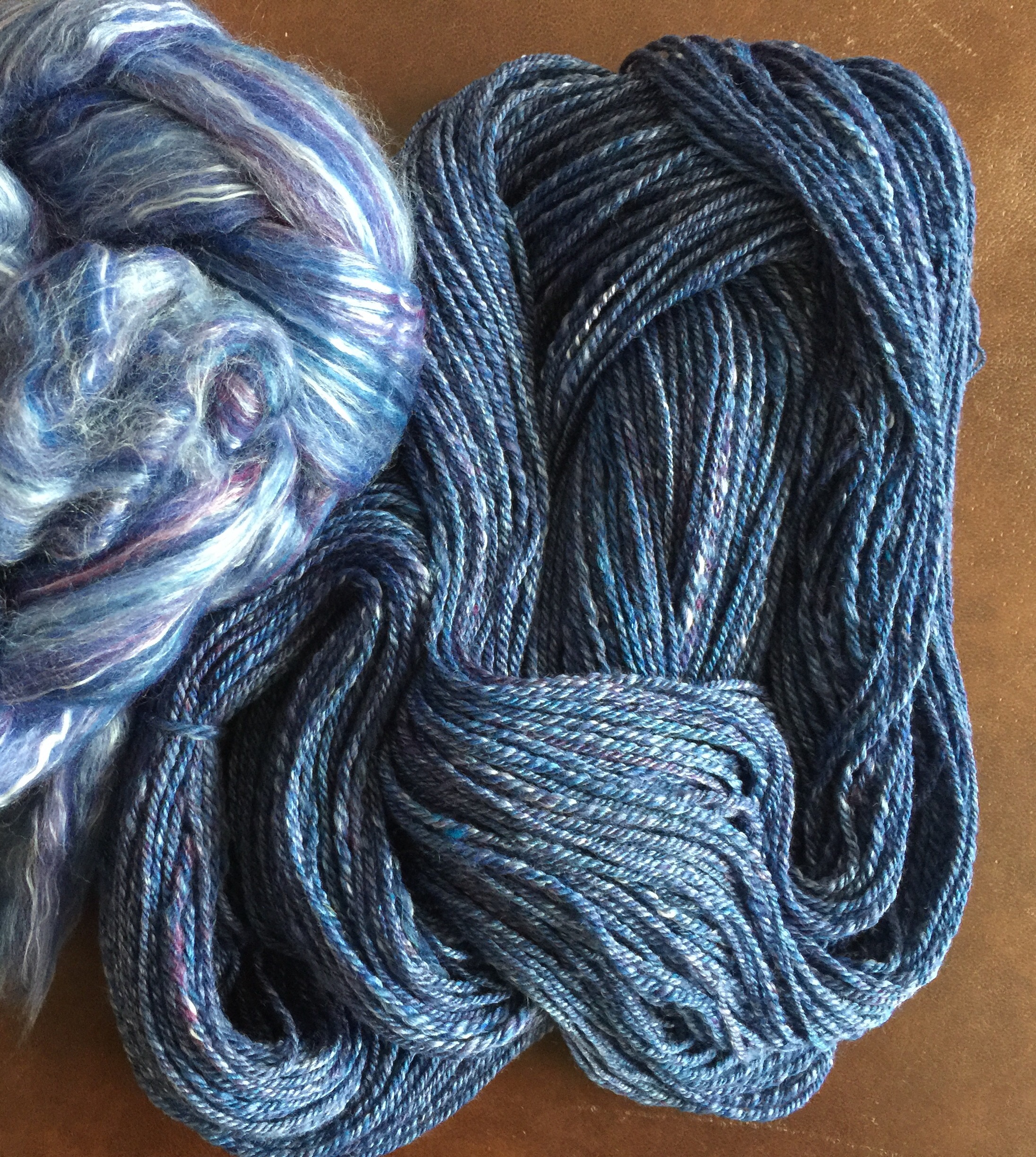 Ich habe mich dafür entschieden, die blaue Merino- Sojaseidenmischung zu einem zweifach gezwirnten Lacegarn zu verspinnen.