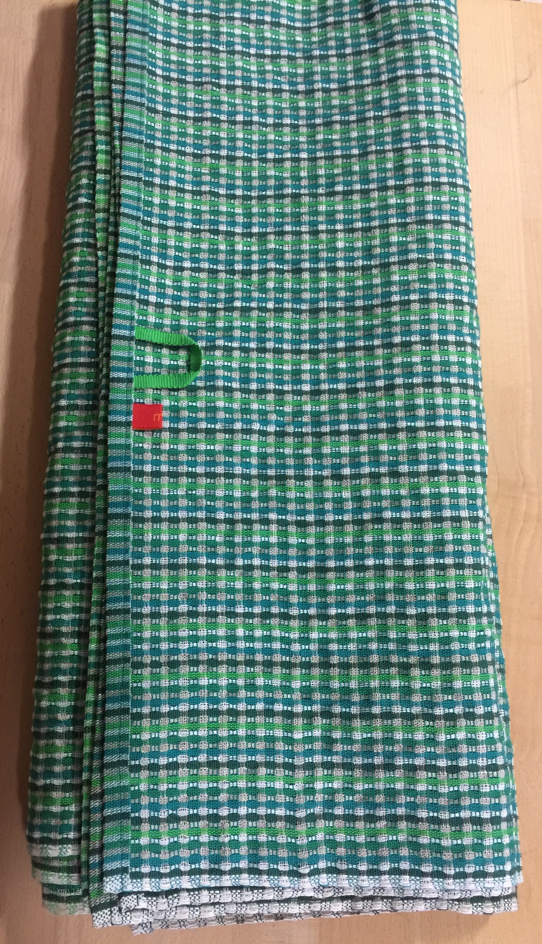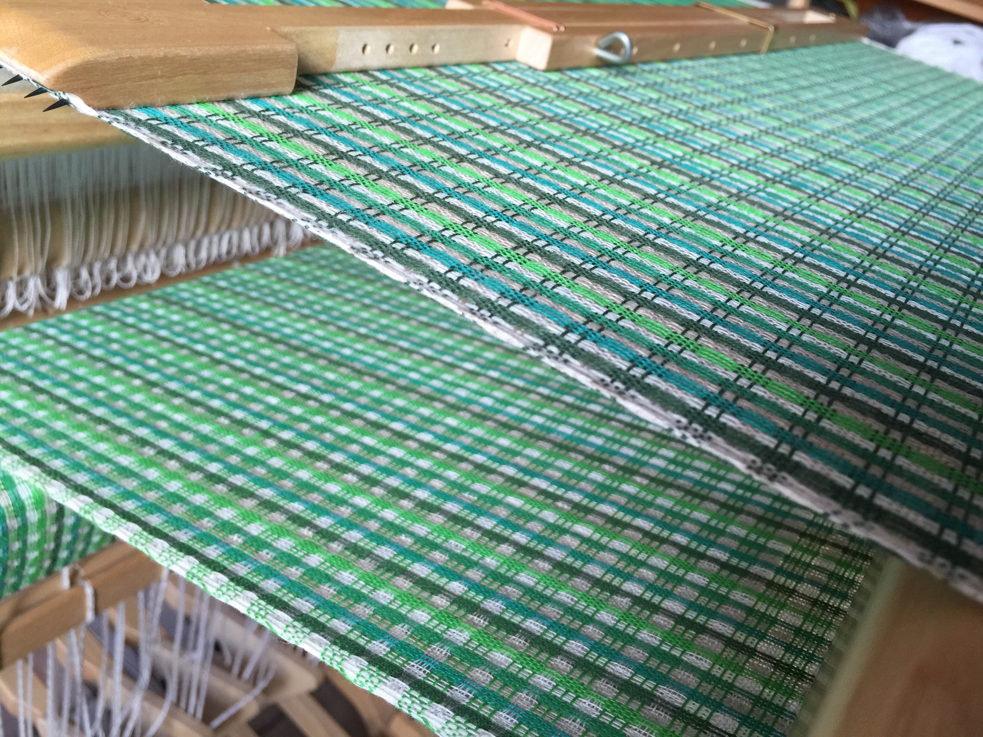 Nun sind meine gewobenen Handtücher (Bindungsentwurf von Winnie Poulsen) fertig getrocknet und gemangelt. Ich bin ganz zufrieden damit. Man sieht auch recht gut die Kreise, die durch die Art der Bindung und der Verwendung unterschiedlicher Materialien (Leinen und Baumwolle) entstanden sind – Flottierungen, die sich durch’s Waschen zusammenziehen.