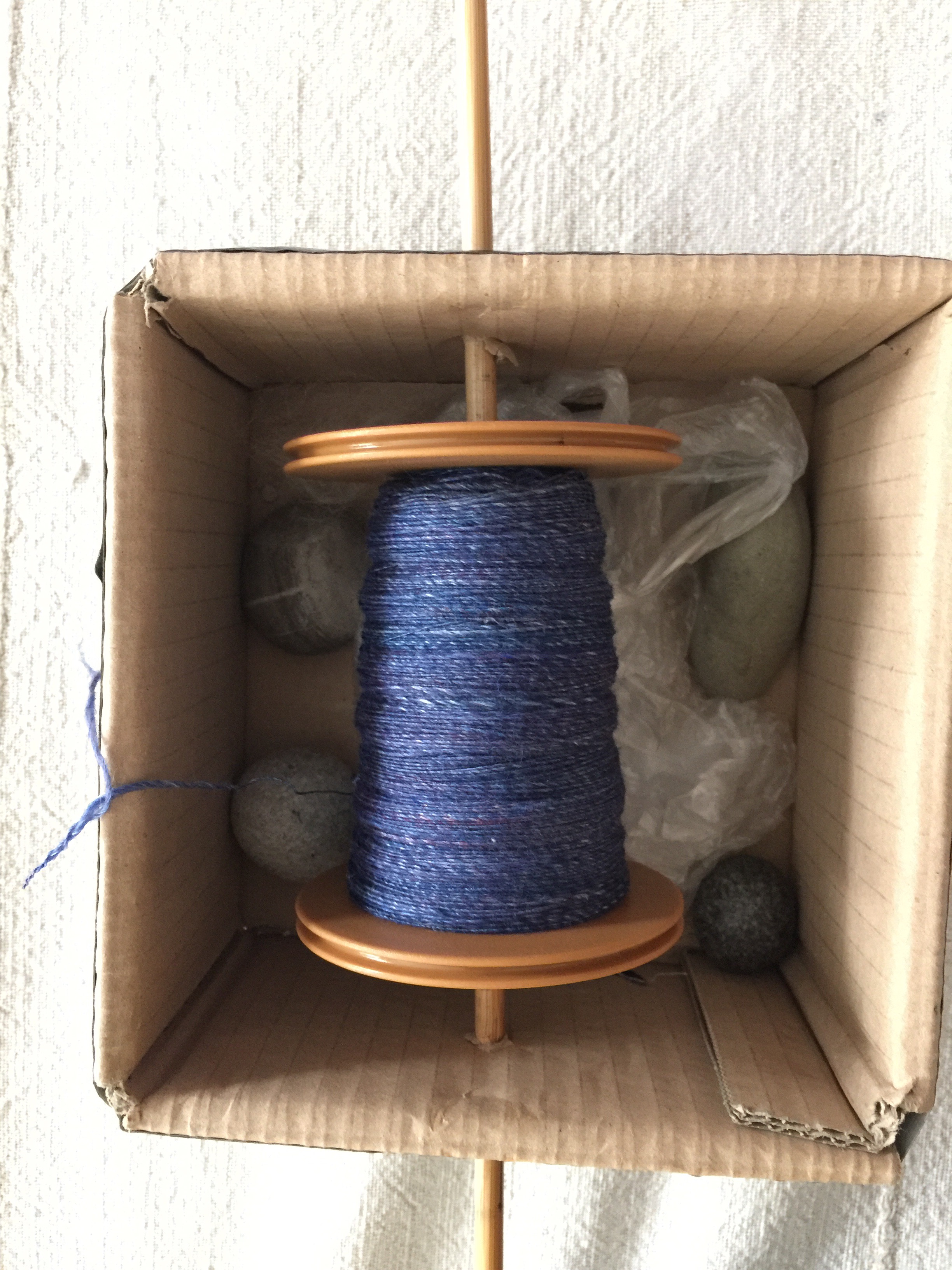 So heißt das Teil, mit dessen Hilfe der Faden abgewickelt wird – gebastelt aus einer Schachtel. Eine Stricknadel hält die Spule, die Steine halten die Schachtel am Boden und das Plastiksackerl dient als Spulenbremse, das je nach Bedarf drapiert wird, damit sich der Faden kontrolliert abwickeln kann. Somit steht dem Verzwirnen nichts mehr entgegen.