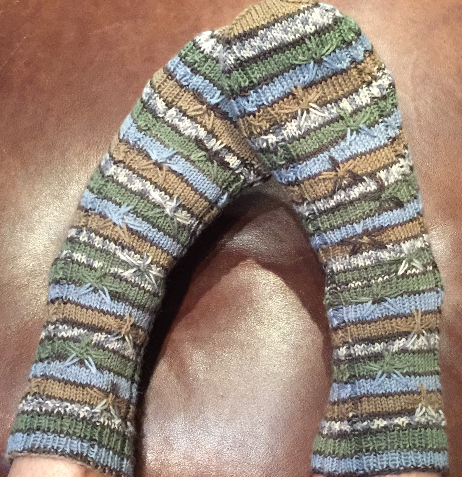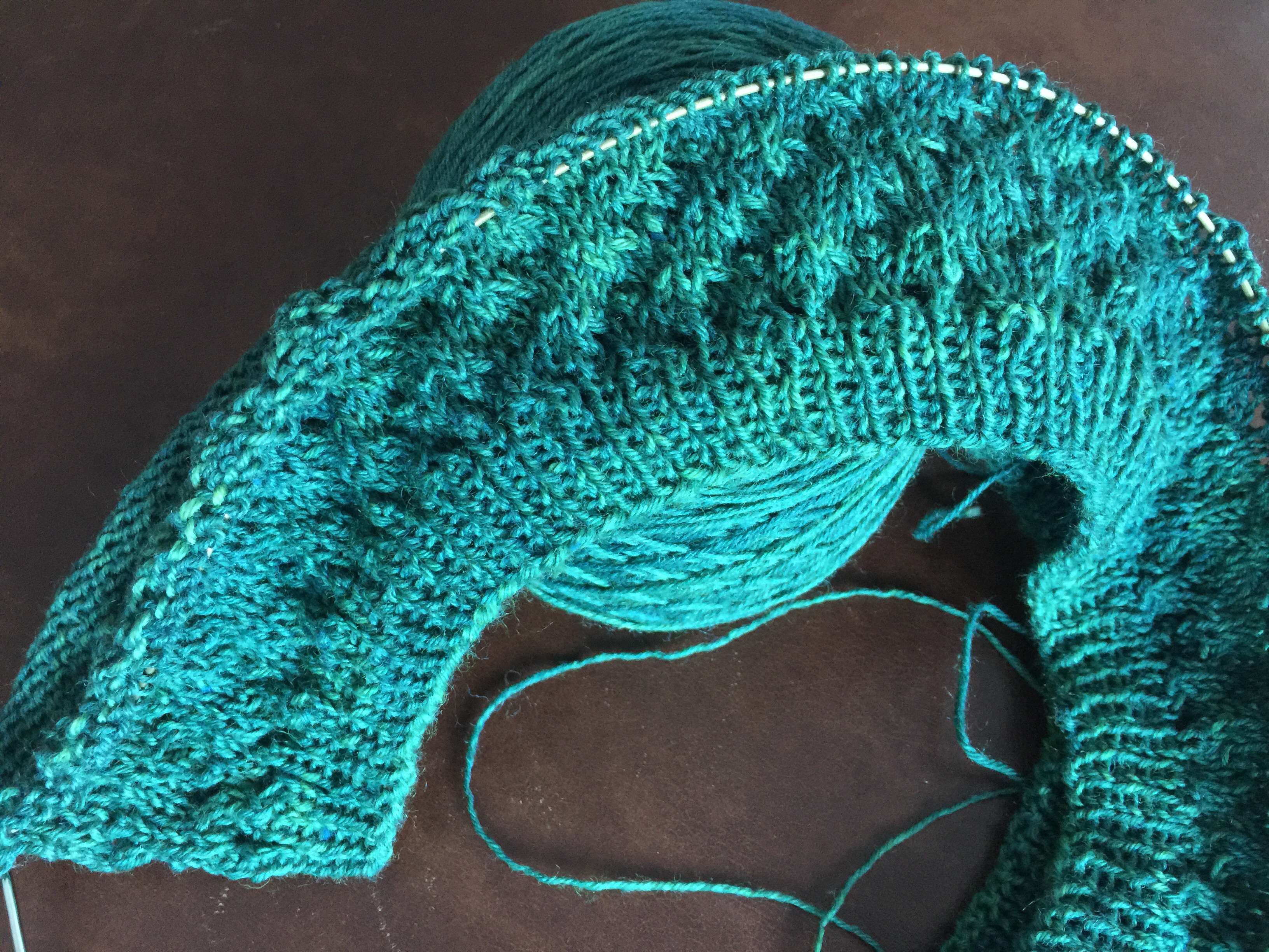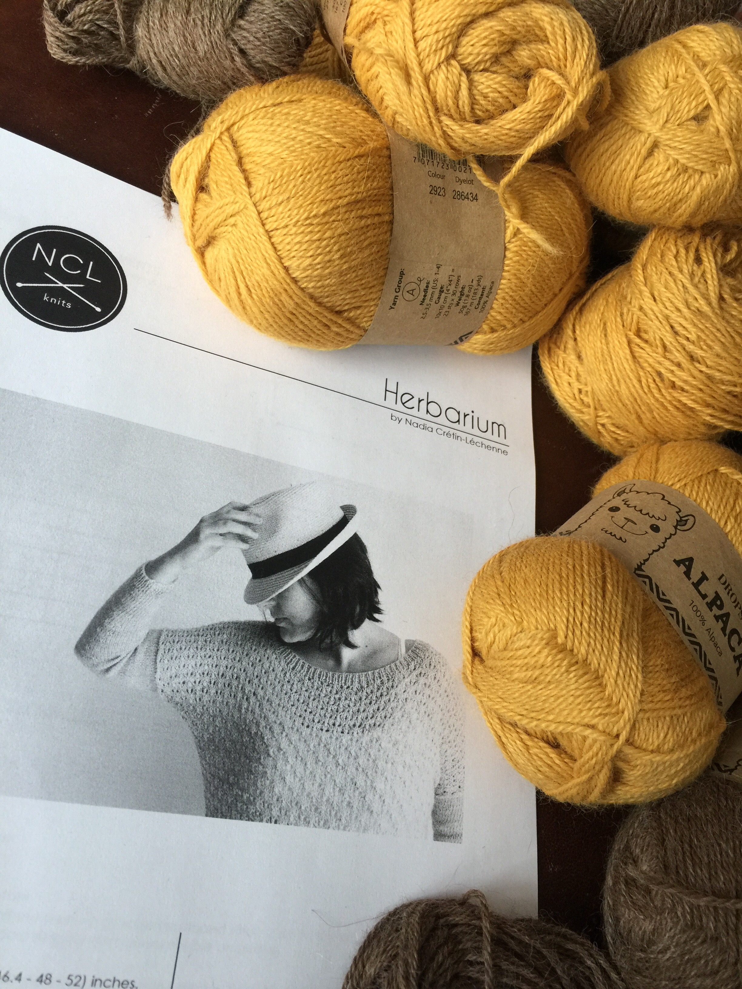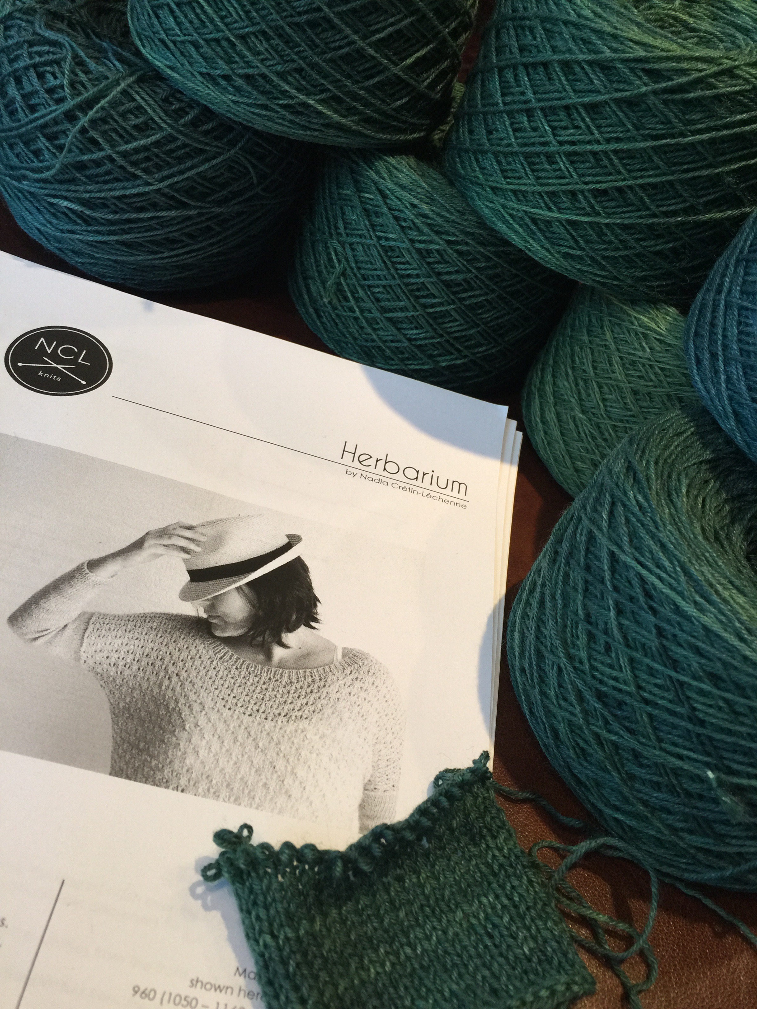 Meine Entscheidung für den Herbarium-Pulli ist gefallen. Durch die exakt passende Maschenprobe beeinflusst habe ich mich für die Wolle entschieden, die ich nach anfänglicher Pflanzen-gelb-färbung mit Indigo überfärbt habe. Der einzige Nachteil: ich werde jetzt ständig mit mehr oder weniger blauen Fingern herumlaufen, weil ich die Wolle nach dem Indigobad zu wenig gut gespült habe. Nach der ersten Wäsche des Pullovers färbt dann nichts mehr ab.