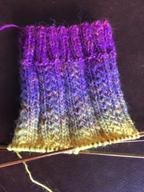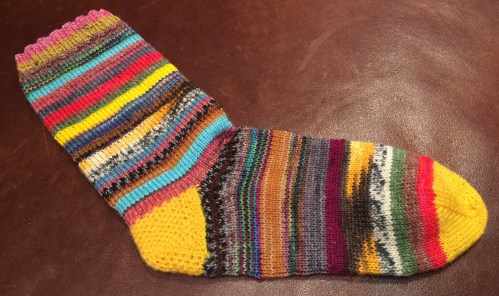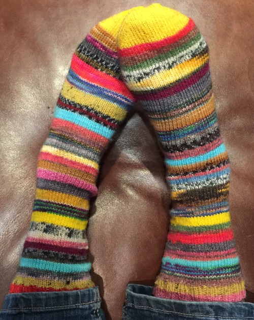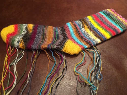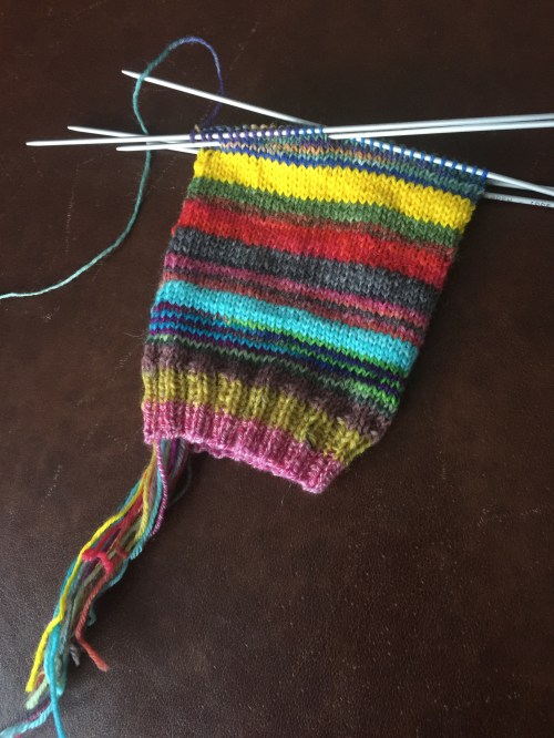 Schon lange wollte ich Socken aus Resten stricken. Jetzt endlich habe ich damit begonnen – obwohl ich gefühlte 1000 Fäden vernähen muss.