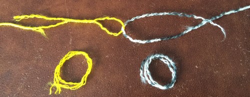 Ich habe das jeweilige Endstück des Fadens geteilt, habe die eine Hälfte jeweils abgerissen und zu einer Schlinge gelegt (somit hatte der Fäden wieder die ursprüngliche Stärke), die Schlingen ineinander gelegt und dann vorsichtig weitergestrickt, als ob es ein Faden wäre. Das hat recht gut funktioniert. Allerdings dauert es auch seine Zeit – deshalb bin ich dann wieder dazu übergegangen, die Fäden zu vernähen, weil das auch nicht länger dauert.