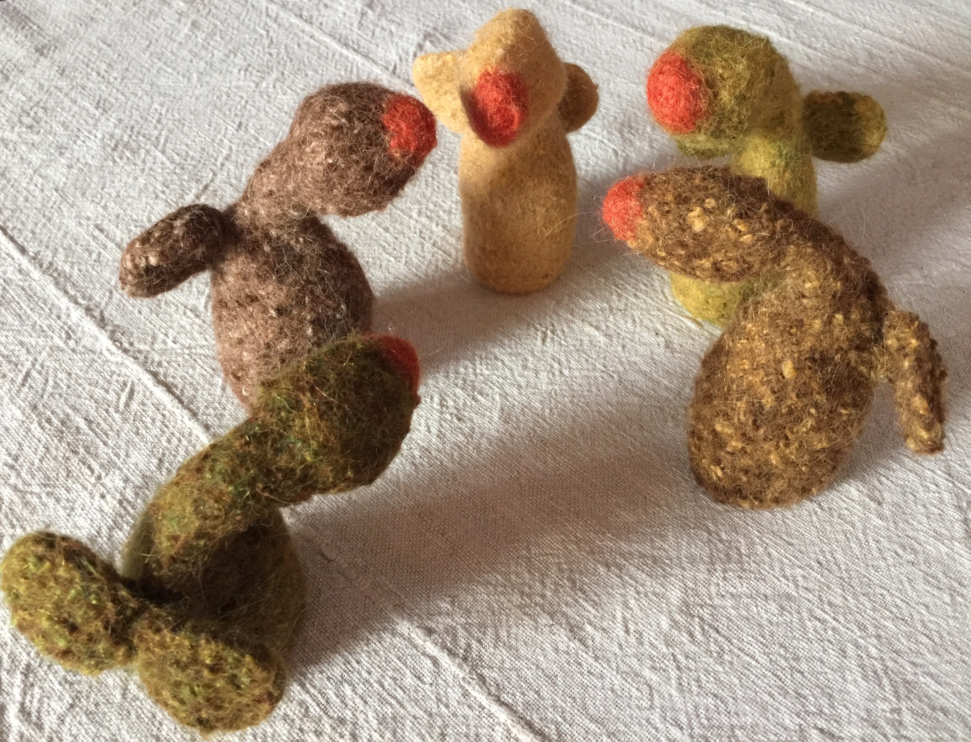 Heute sind meine Osterhühner fertig geworden – sie sollten Frühstückseier wärmen. Im Moment stehen sie noch etwas unentschlossen herum…..