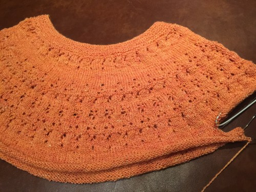 Mit meiner handgesponnenen Merino/Seide habe ich nun angefangen, den Pulli „Gardis“ zu stricken. Es sind ca. 1200 m geworden – das wird knapp. Wir werden sehen, ob es sich ausgeht.