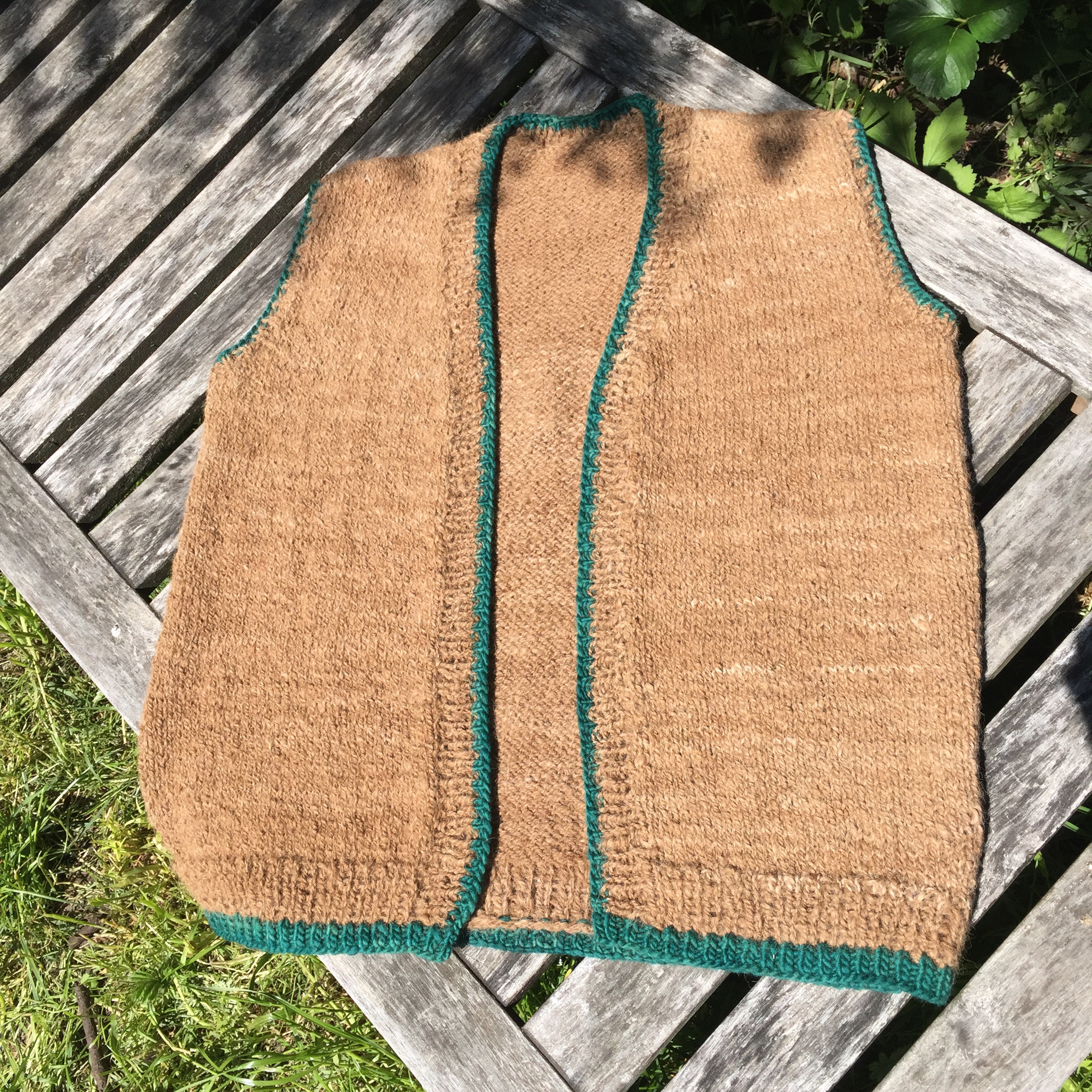 Ich habe handgesponnene Alpakawolle geschenkt bekommen (danke!!), mein Mann liebt ärmellose Westen, somit habe ich eine gestrickt (Nadeln 4 mm) – mit Restewolle rundherum.