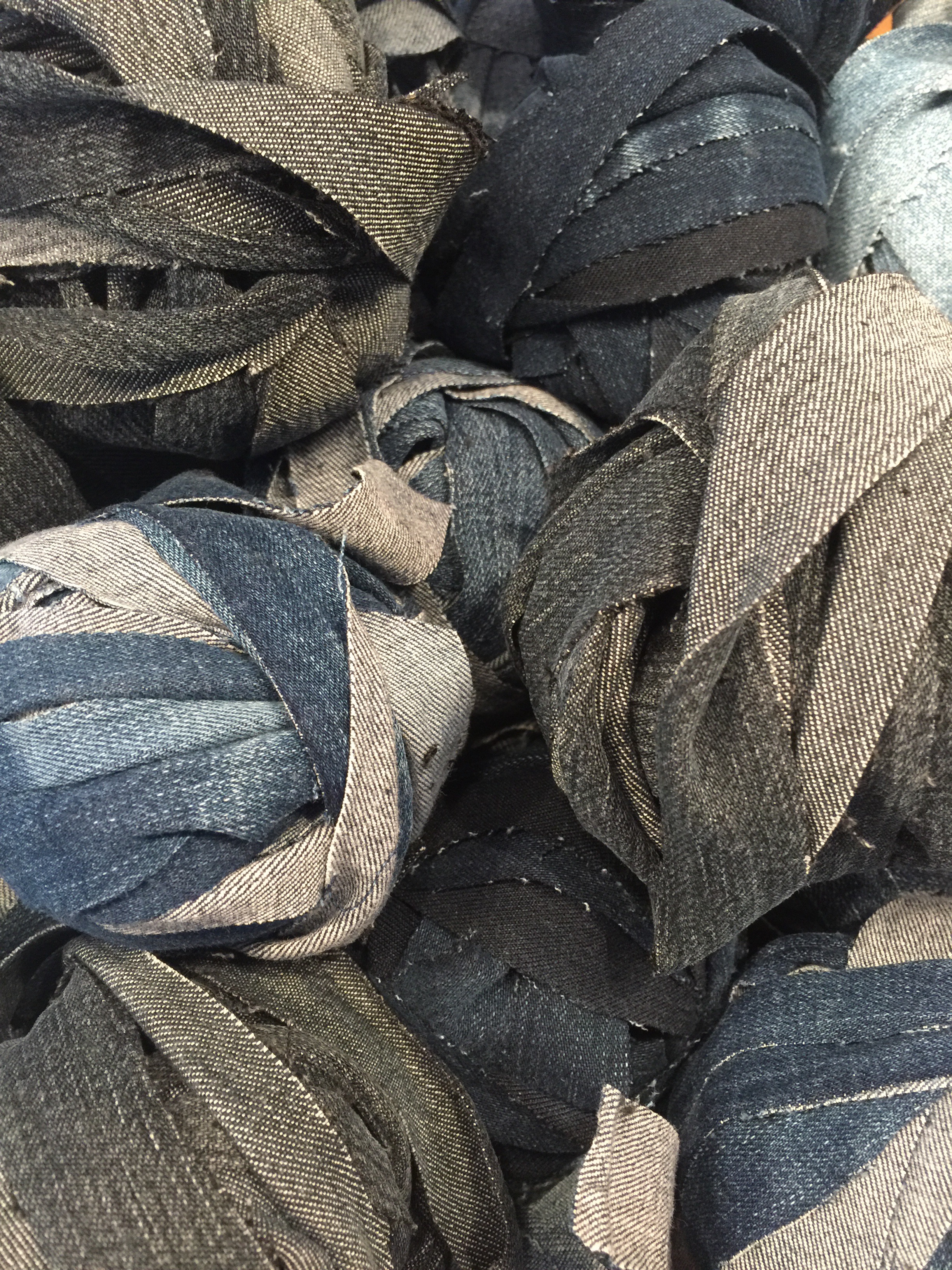 Ich möchte einen Hängesessel weben und habe dafür erst einmal alte Jeans in Streifen geschnitten.