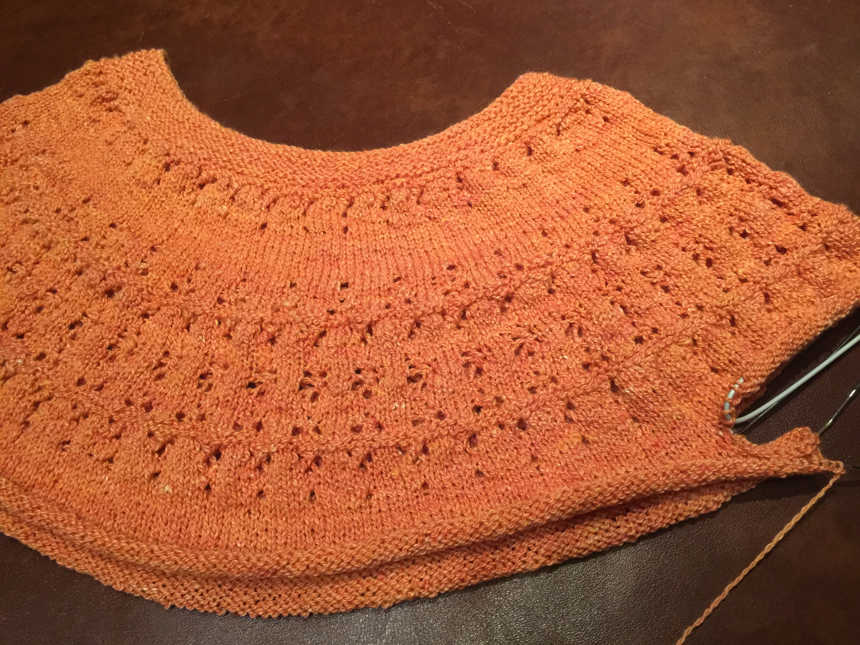 Mit meiner handgesponnenen Merino/Seide habe ich nun angefangen, den Pulli „Gardis“ zu stricken. Es sind ca. 1200 m geworden – das wird knapp. Wir werden sehen, ob es sich ausgeht.