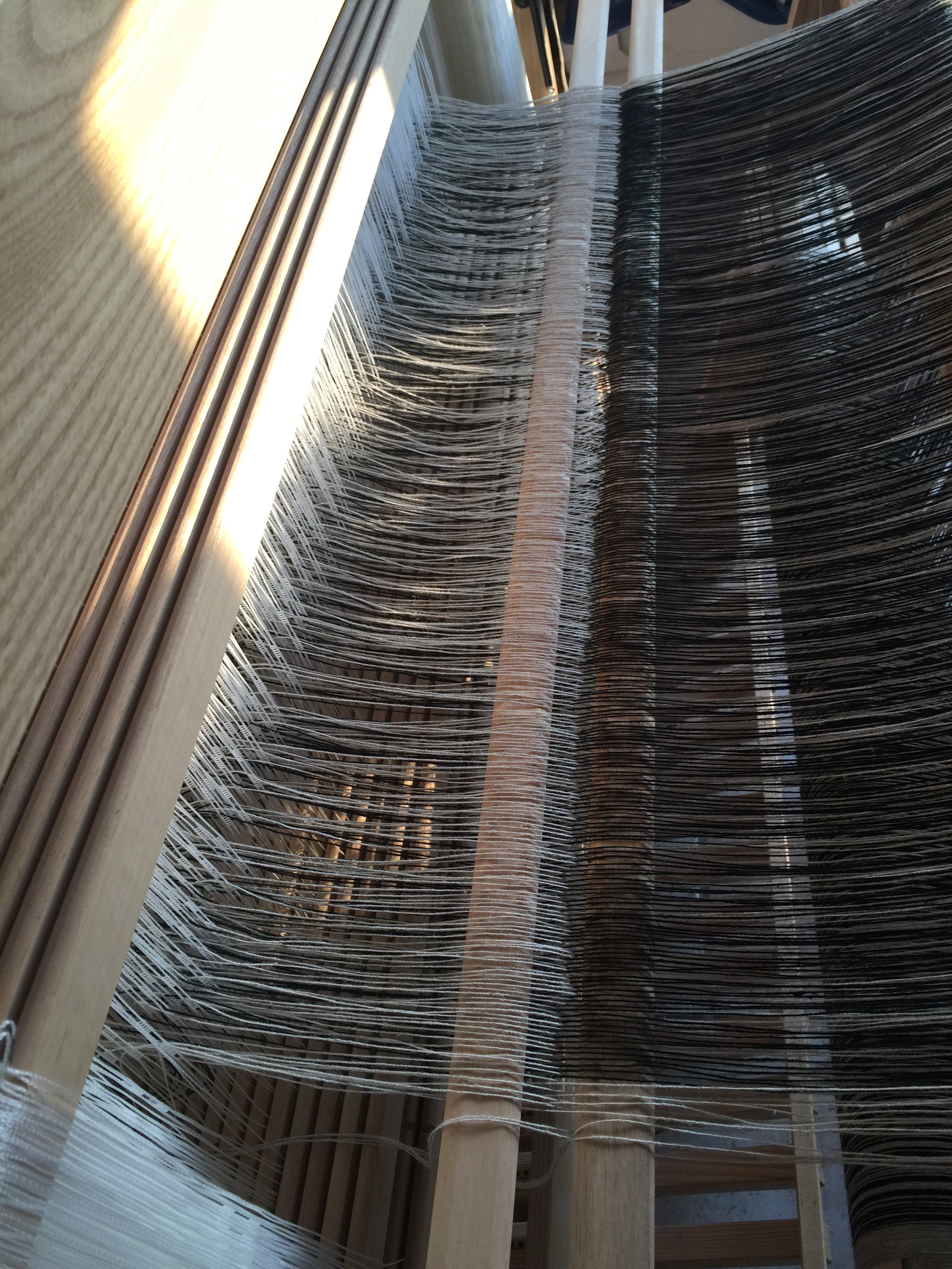Ich beginne mit den schwarz-weißen Handtüchern und werde dann die Kette von den rot-weißen direkt an die schwarz-weiße Kette anknüpfen. Dann muss ich nicht nochmals fädeln und Blatt stechen. Obwohl ich das alles auch sehr gerne mache.