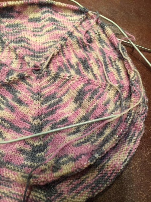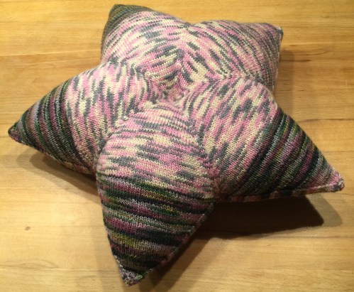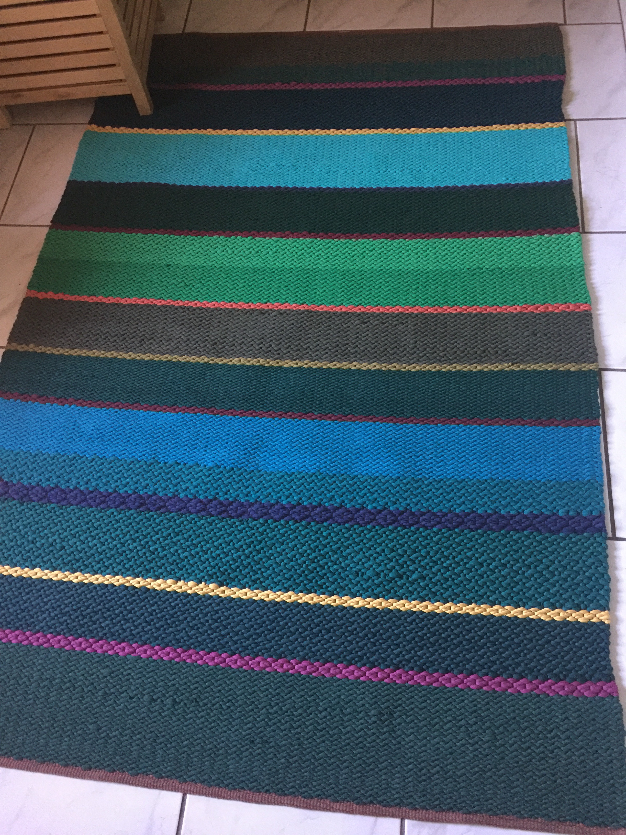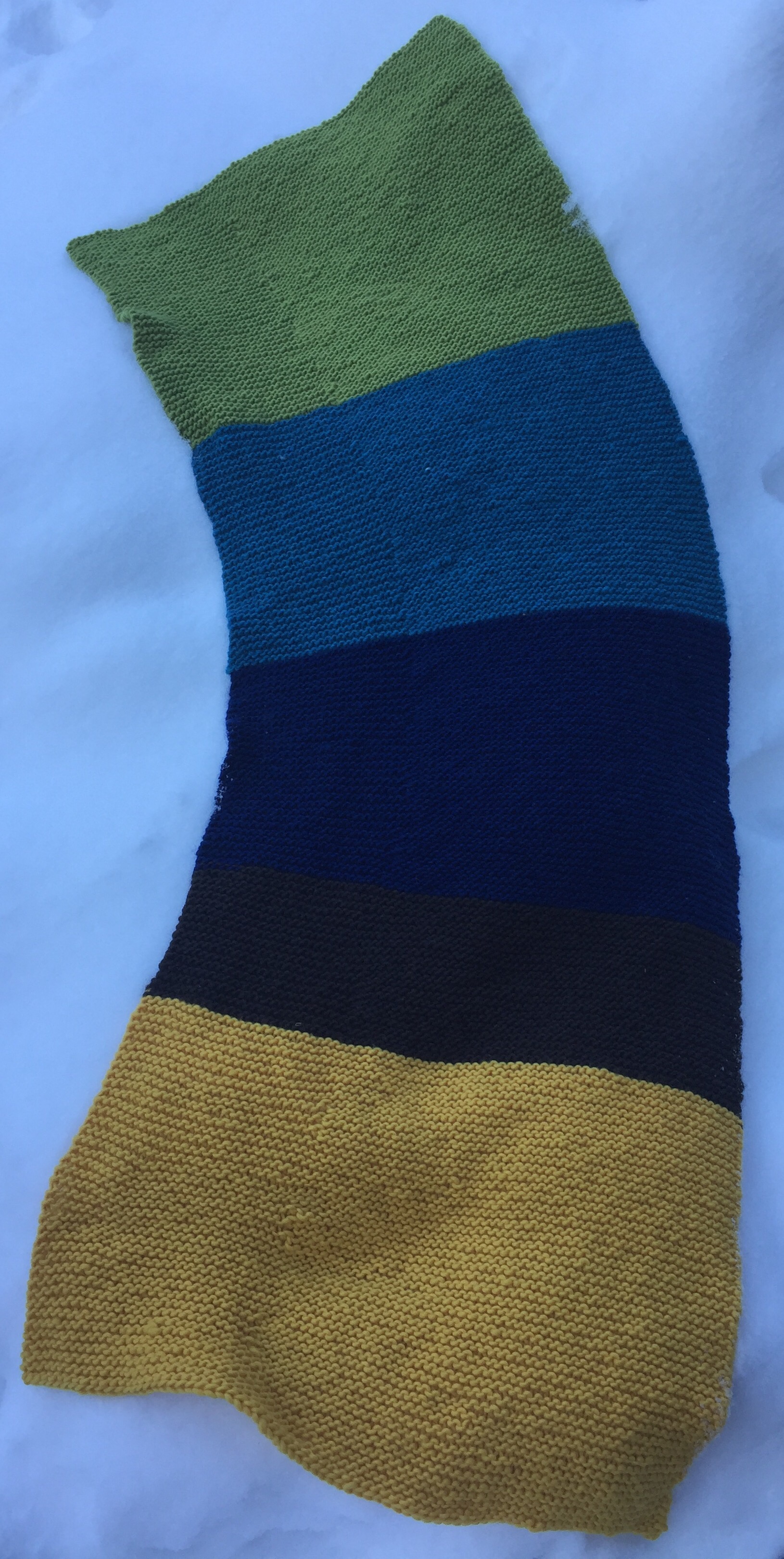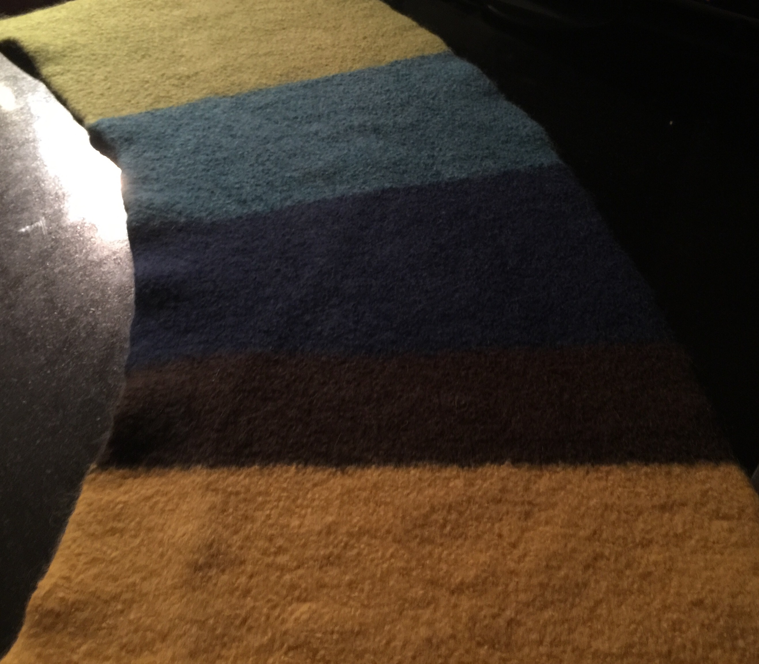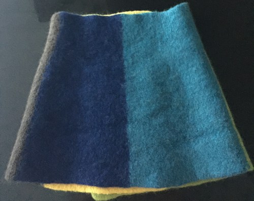 Er sieht hübsch aus und hat mich um die Hüften herum schön warm gehalten – und das bei zweistelligen Minusgraden. Aber er hat sich auch gedehnt, sodass er jetzt nicht mehr wirklich gut sitzt. Er war mir auch von Anfang an schon ein bisschen zu weich. Ich befürchte, dass die Wolle, die ich verstrickt habe, möglicherweise eine superwash Ausrüstung hatte – kontraproduktiv für’s Filzen.
