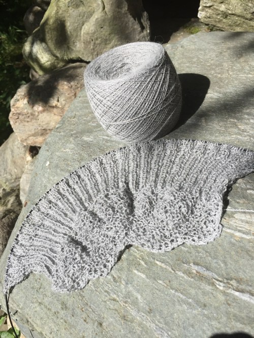 Ich habe mein ideales Projekt – auch thematisch sehr passend – gefunden, es ist das Seashell Tuch. Ich stricke mit Drops Lace (800 m / 100 g, 70% Alpaka, 30% Seide) mit Nadeln Nr. 3.