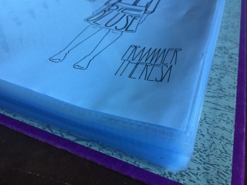 Daheim angekommen habe ich jede Seite einzeln in eine Klarsichtfolie gesteckt und in eine Mappe gegeben. Ich hab so eine Freude mit diesem Werk von Theresa Prammer (sie hat zuerst Theaterwissenschaft studiert und dann noch eine Ausbildung zur Schneidermeisterin gemacht).