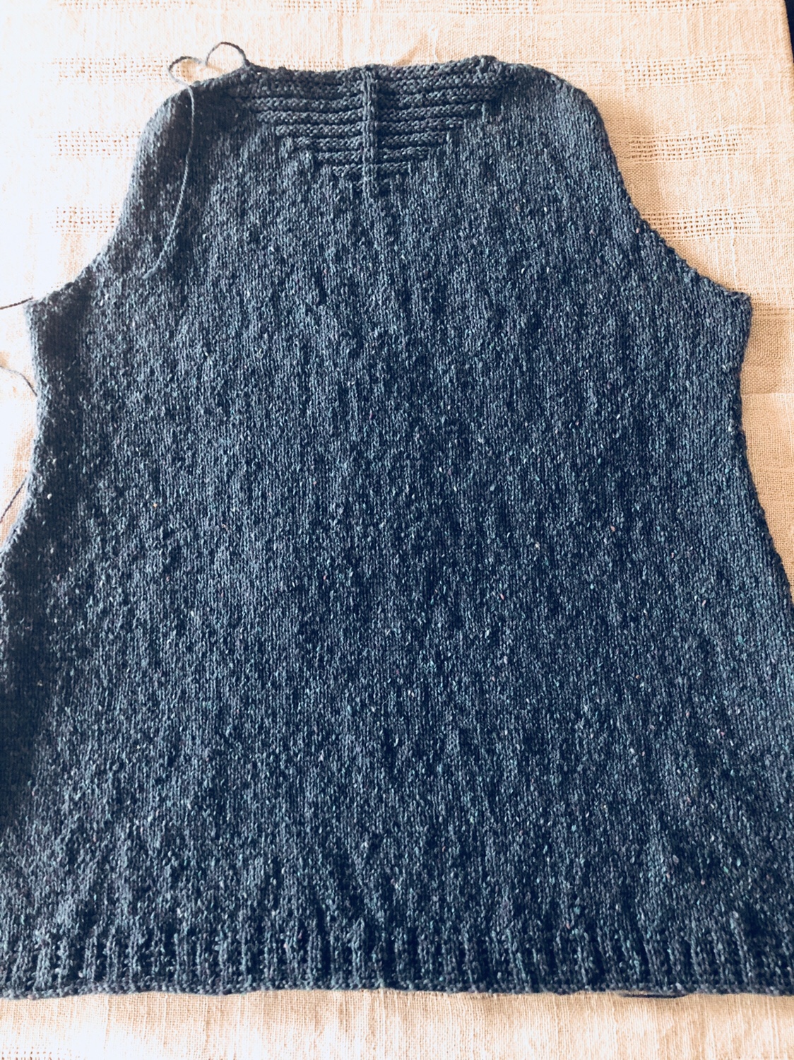 Die Einen stricken Maschenproben 10×10 cm, die Anderen stricken sie etwas größer. Ich habe gleich den ganzen Rücken gestrickt, um schlussendlich festzustellen, dass ich doch dickere Nadeln verwenden sollte.