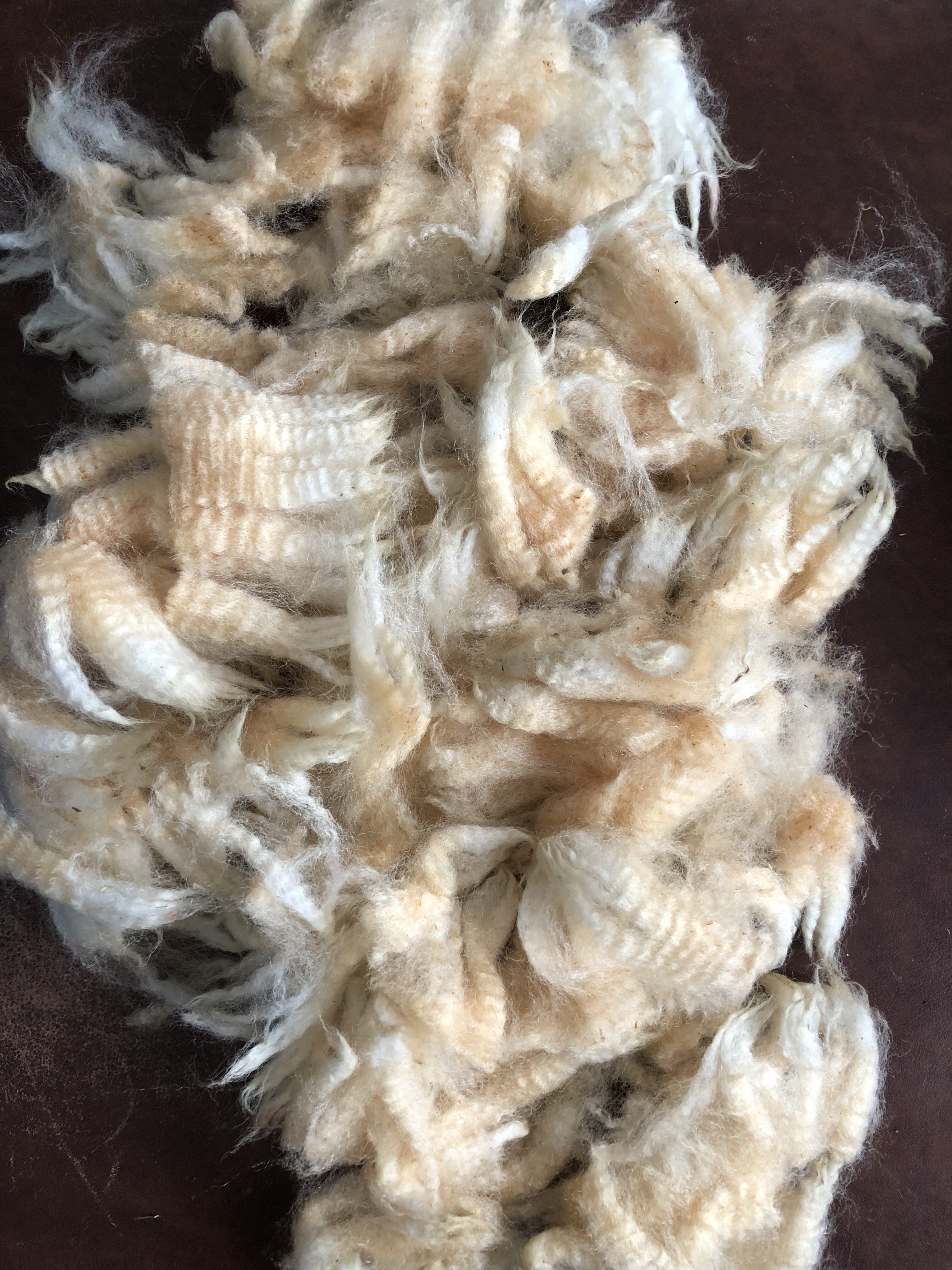 Ich habe gestern angefangen, die Wolle zum Waschen vorzubereiten. Hier die ungewaschene, noch sehr fettige Wolle: