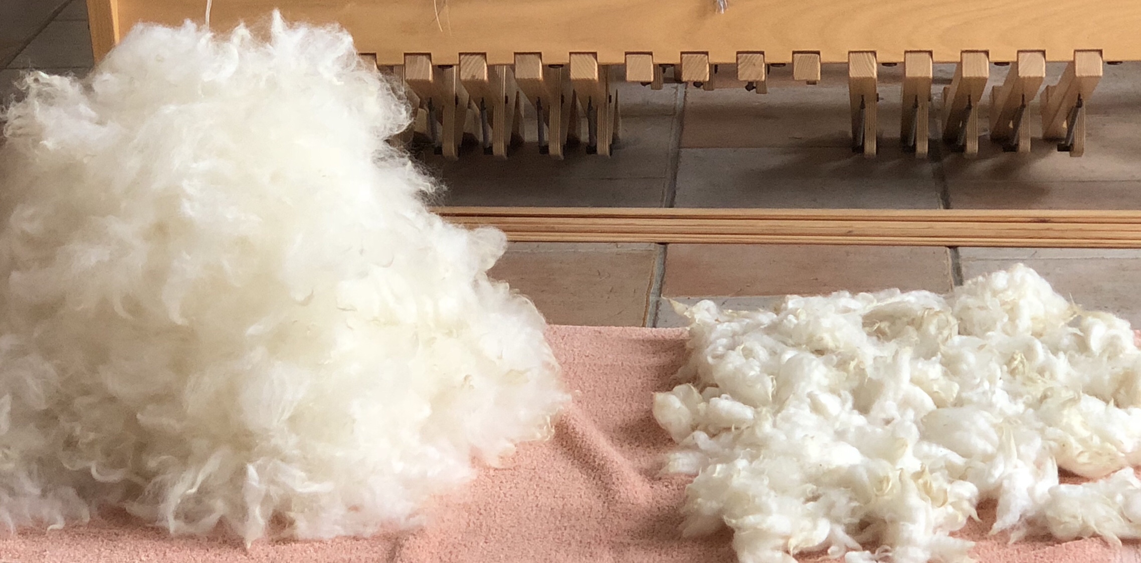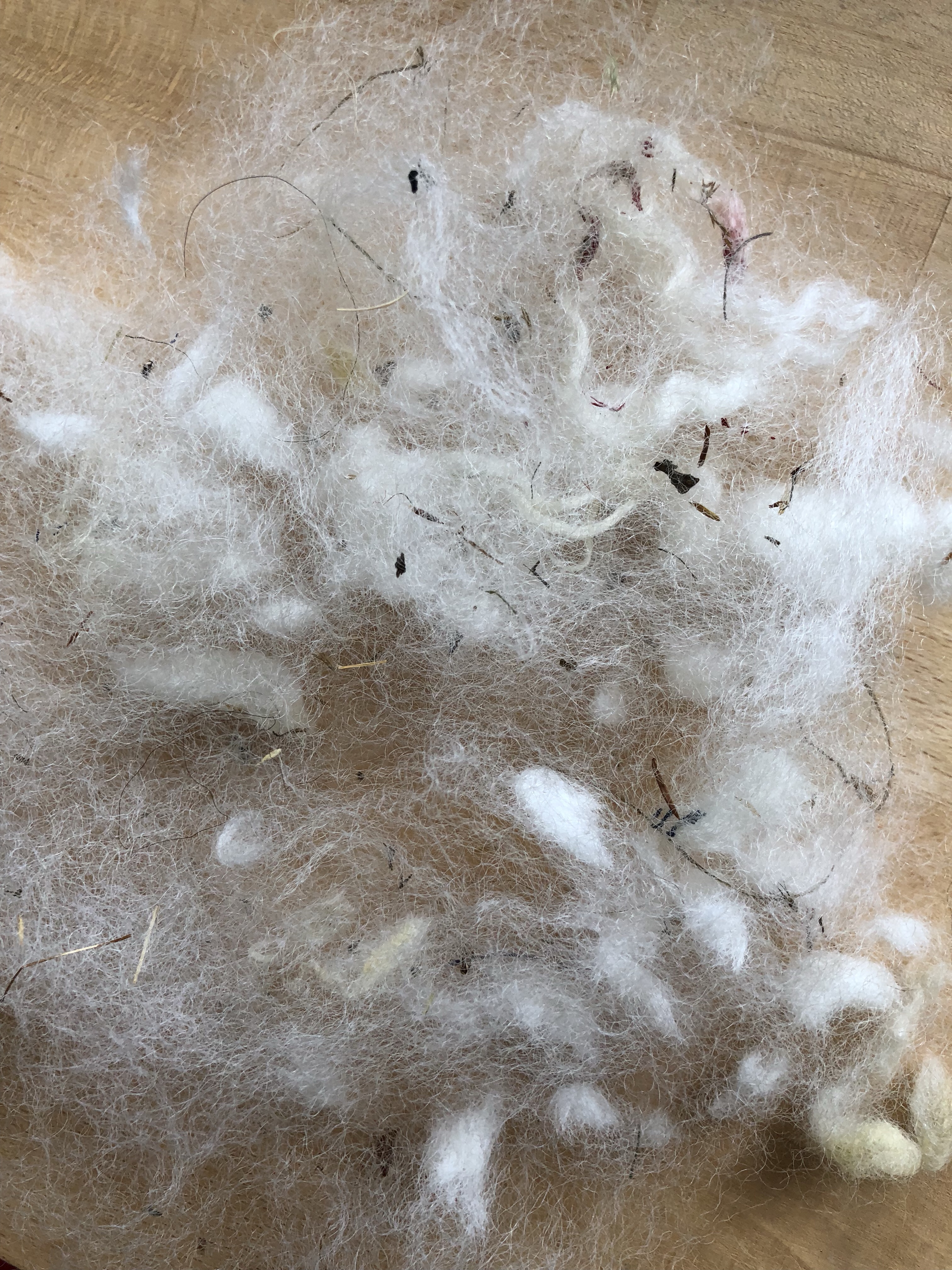 Anschließend habe ich die Wolle zum Trocknen aufgelegt und dann gezupft (von noch verbliebenen Verunreinigungen und von zu kurzen Stückchen befreit), damit ich sie im nächsten Arbeitsgang kardieren kann. Hier liegt rechts die noch nasse Wolle, links sieht man die bereits getrocknete, gezupfte Wolle, die jetzt kardiert werden kann.