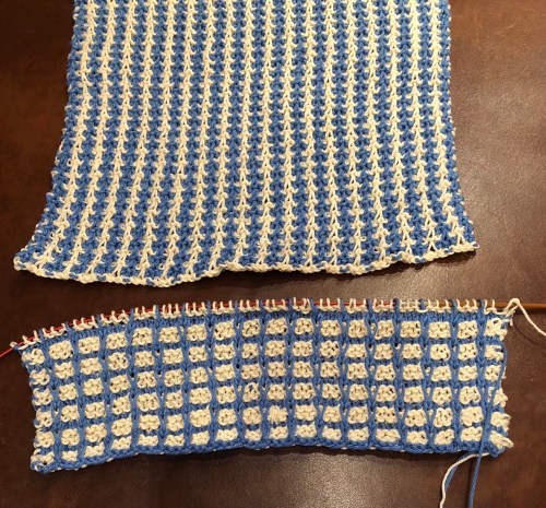 Da ich aber immer ein „Nebenbei“ Strickprojekt haben möchte, habe ich statt der Socken was Neues zu stricken begonnen – nämlich Putzlappen aus Baumwolle. Ich möchte wirklich gerne mein Garnlager reduzieren.