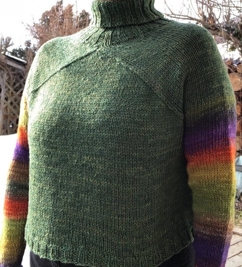 I love it! And nice modeling, too 🙂 I think that the colorful sleeves add a nice zing to the sweater.