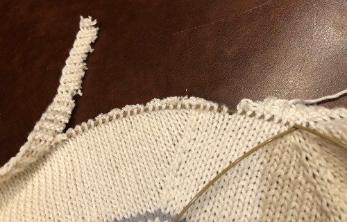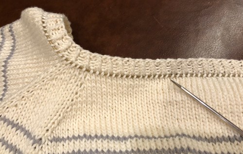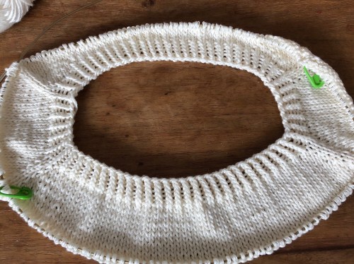 Den Ausschnitt haeb ich ja ein zweites mal angefangen zu stricken, weil ich ursprünglich dachte, er wäre mir zu eng. Er ist mir jetzt aber viel zu weit, das hätte also schon gepasst am Anfang. Jetzt hab ich beschlossen, ich nehme am fertigen Stück die Maschen um den Ausschnitt auf eine Nadel,