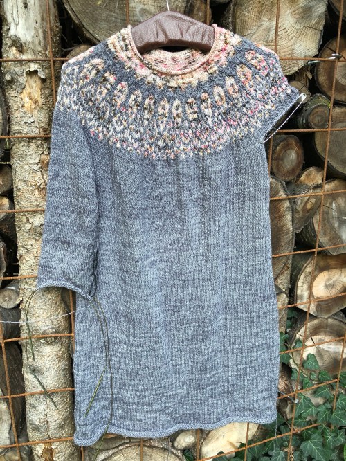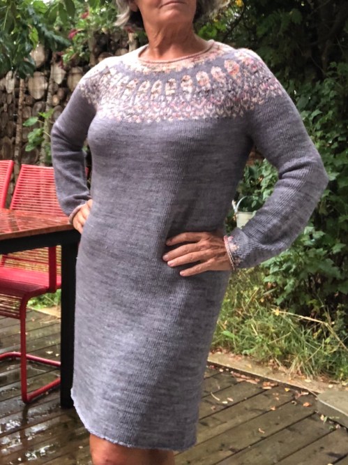 Ich habe den Sipila Sweater verlängert und ein Kleid daraus gestrickt. Ich bin ganz glücklich damit, es ist gut gelungen.