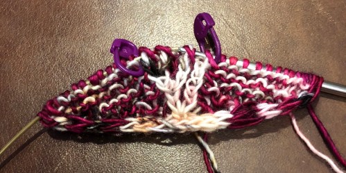 Das wird mein neues Strickprojekt – Peachy – ein sehr großes Tuch, teilweise mit zweifarbigem Patent gestrickt. Man braucht dafür zwei gesprenkelte und zwei unifarbene Stränge.