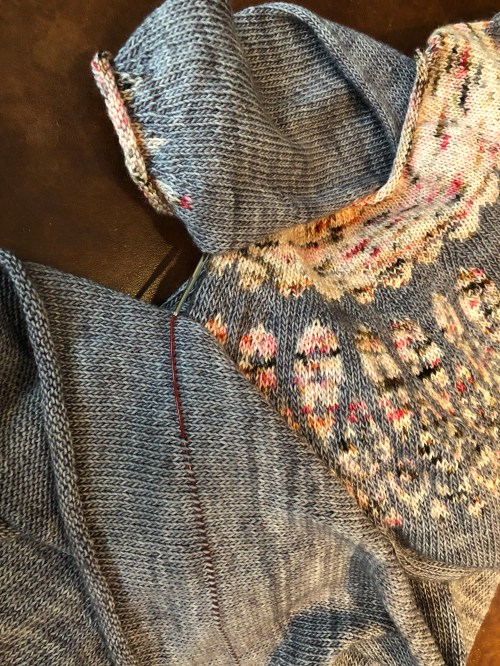 Es ist ein Pulli, der an der Passe zweifärbig gearbeitet wird, dann geht’s einfärbig weiter. Ich möchte den Pulli verlängern und ein Kleid stricken – deshalb die Menge an Wolle.