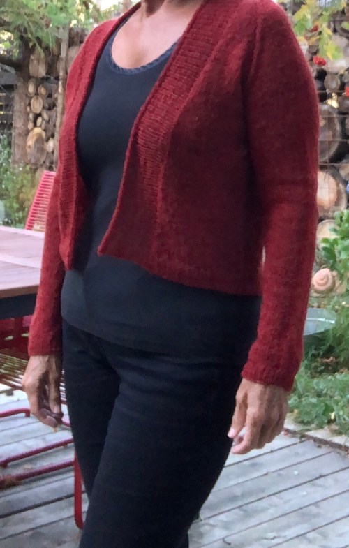 Es ist der Featherweight Cardigan, den ich aus meiner Corriedale (80%) Bambus (20%) Wolle gestrickt habe. Länger als ein Jahr habe ich gebraucht, um auf meinem winzigen Kreuzspindelchen aus dem 3D Drucker dieses Garn fertigzustellen. Ich habe es auf der Spindel zweifach gezwirnt, es läuft ca. 800 m weit (100g).