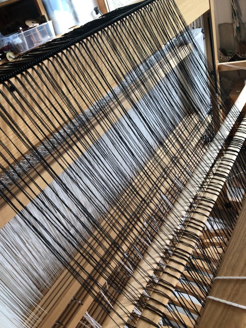 Der blaue Leinenschuss ist mir nach zwei Bahnen ausgegangen. Deshalb habe ich die zwei weiteren Bahnen in braun gewoben. Ich bin ganz glücklich damit!