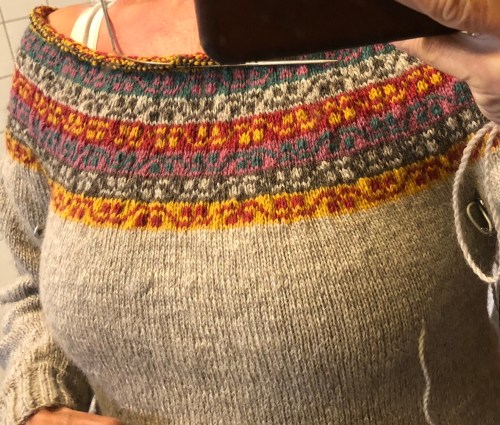 Mein fair isle Pulli könnte schon fertig sein, wäre mir nicht kurz vor Schluss die graue Wolle ausgegangen.
