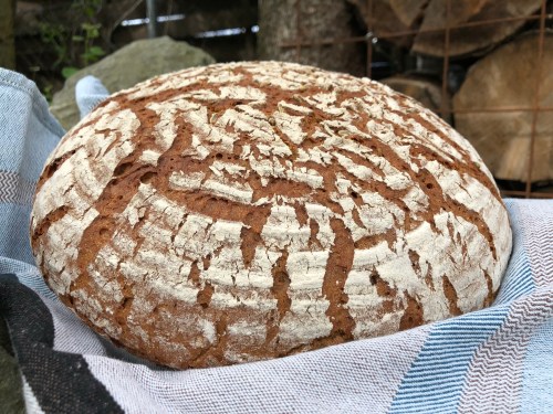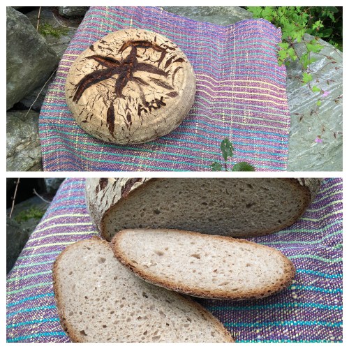 Bei diesem Sauerteigbrot kommen verschiedene Mehlsorten wie Roggenmehl 960, Ruchmehl und Alpenroggen zum Einsatz und es steht ziemlich lange Zeit auf der Gare – incl. Vorteig insgesamt ca. 14 Stunden.