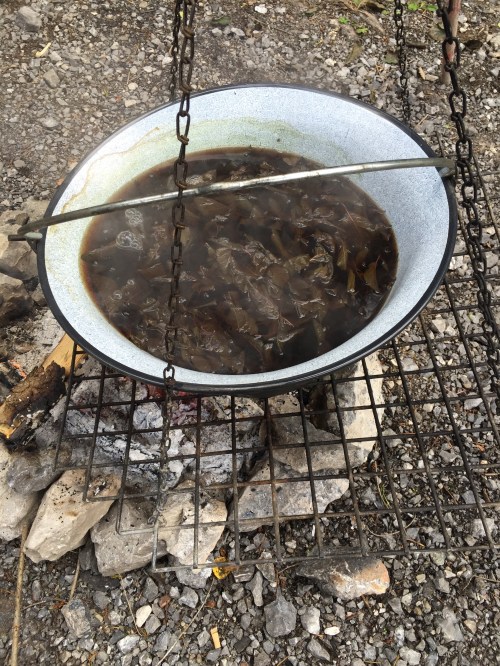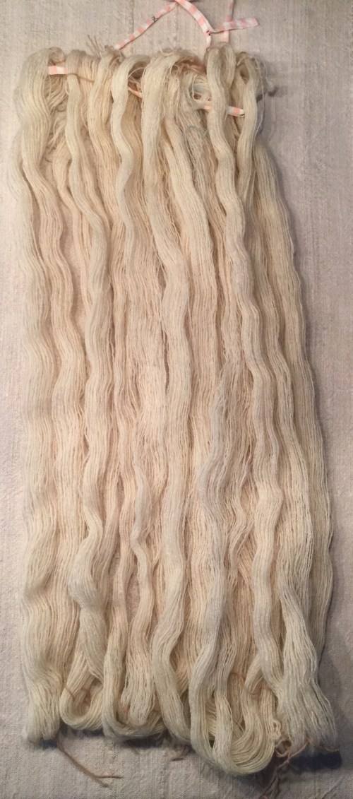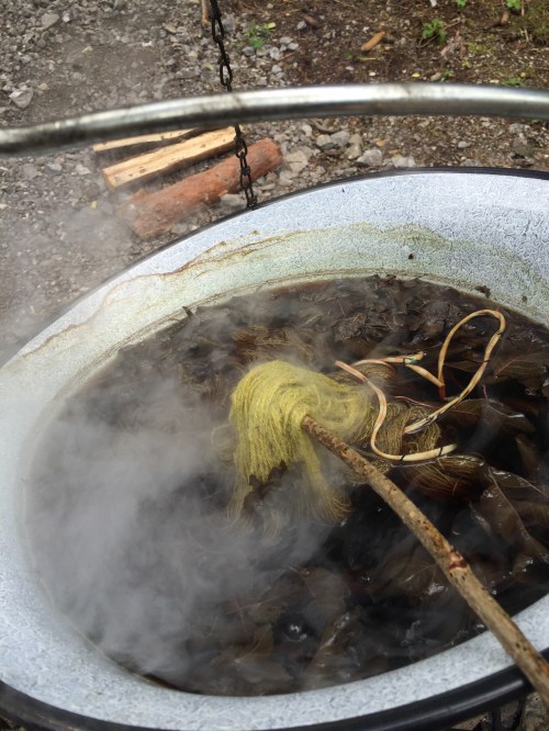 Gefärbt ist sie mit Blutpflaumenblättern und die Nadelstärke, mit der ich sie gestrickt habe, war 3 mm. Sie wiegt 106g.