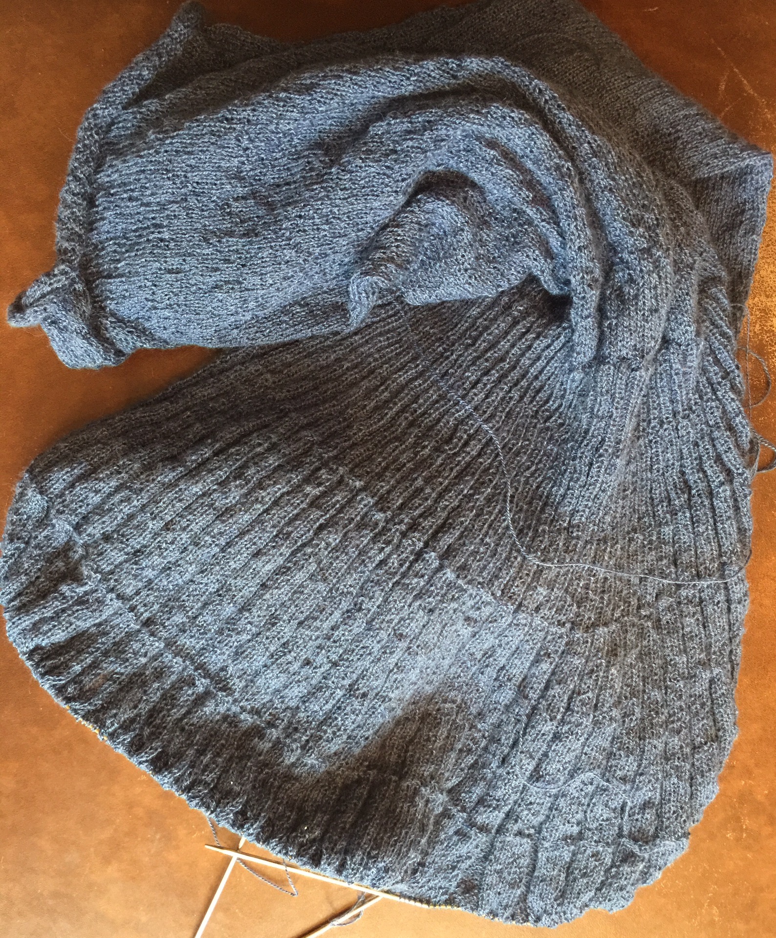 Langsam, aber stetig wächst mein Mäntelchen. Inzwischen brauche ich (als sehr schnelle Strickerin) für eine einzige Reihe länger als eine halbe Stunde – es sind aber auch mittlerweile schon 1350 Maschen.