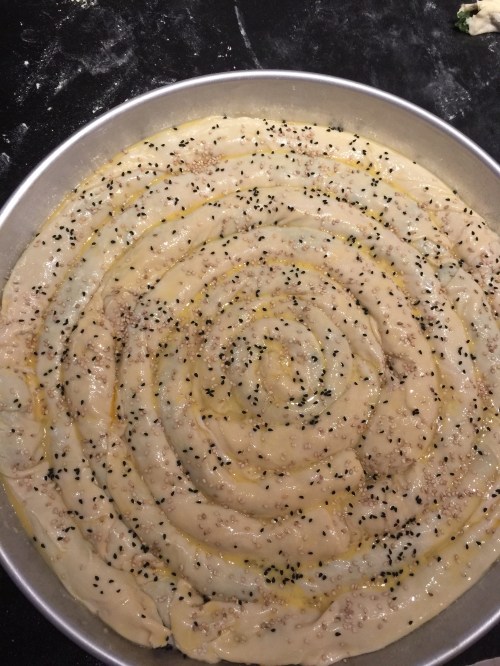 Dieses Gericht habe ich gestern ausprobiert. Ich habe die Teigblätter selbst gemacht und habe sie mit Schafskäse und Spinat gefüllt und mit Sesam und Schwarzkümmel bestreut. Das Ergebnis war – wie soll ich sagen – mäßig.