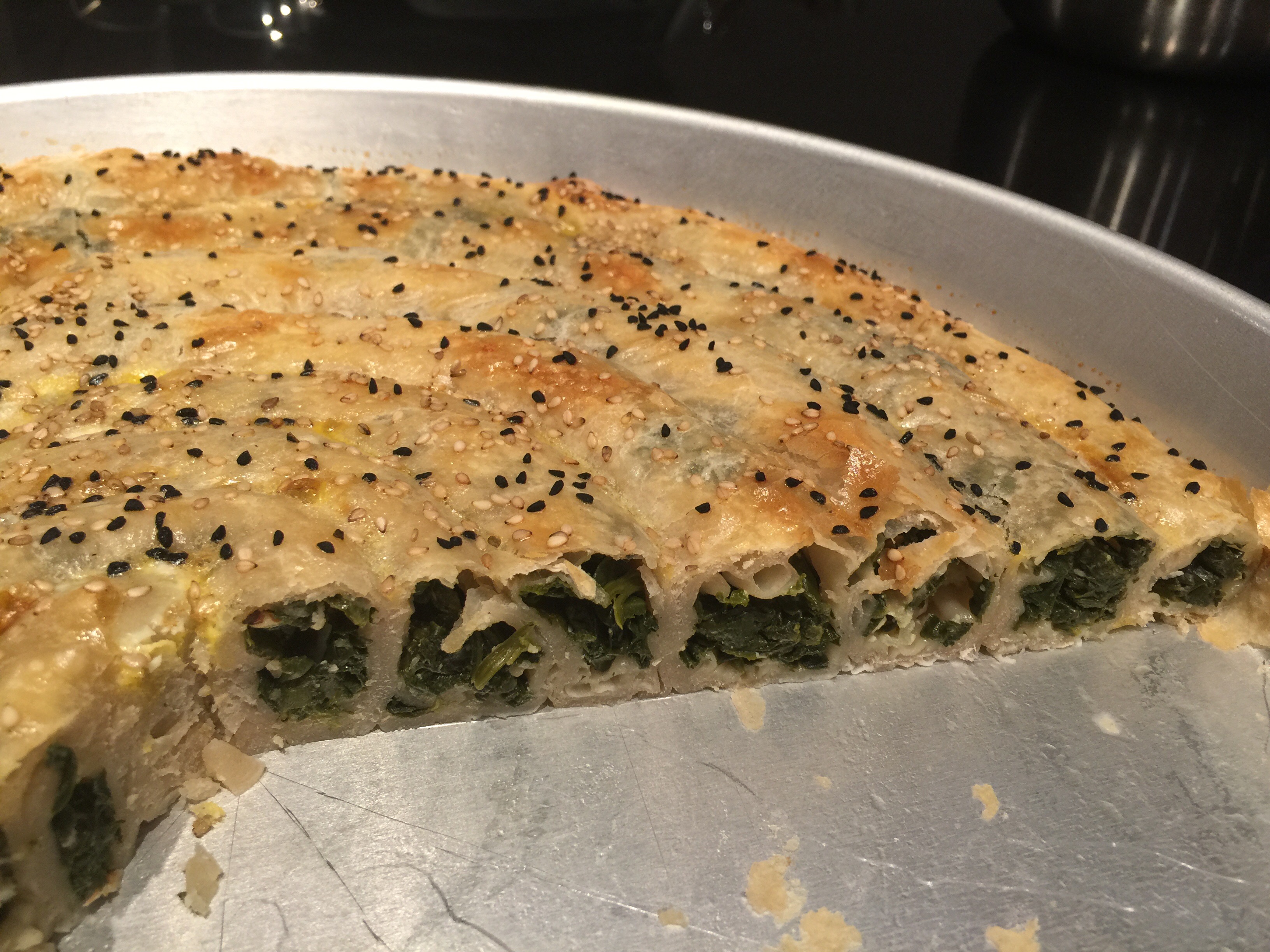 Dieses Gericht habe ich gestern ausprobiert. Ich habe die Teigblätter selbst gemacht und habe sie mit Schafskäse und Spinat gefüllt und mit Sesam und Schwarzkümmel bestreut. Das Ergebnis war – wie soll ich sagen – mäßig.