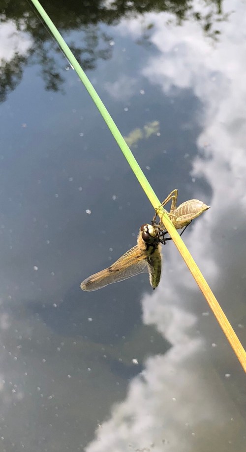 Die Libelle muss jetzt warten, bis sie getrocknet ist, damit sie ihre Flügel ausbreiten kann. Ich glaube, es ist eine Vierflecklibelle.