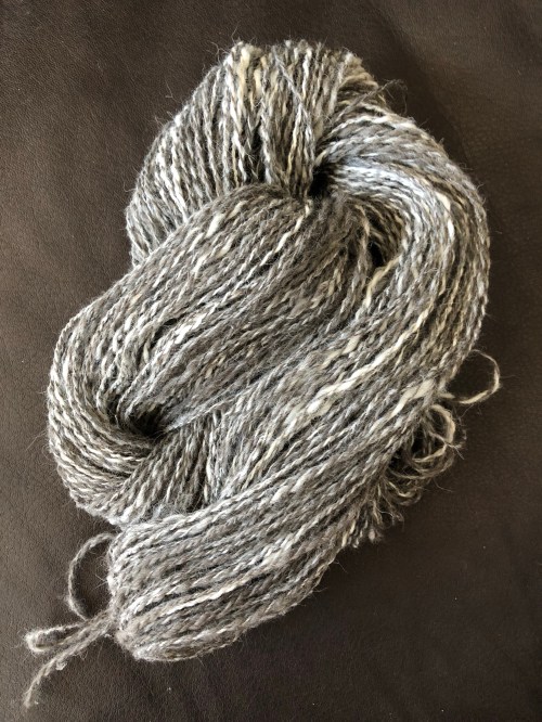 Beim letzten Spinntreffen habe ich Hundewolle versponnen – 45 g Spitz. Heute hab ich sie zweifach gezwirnt.