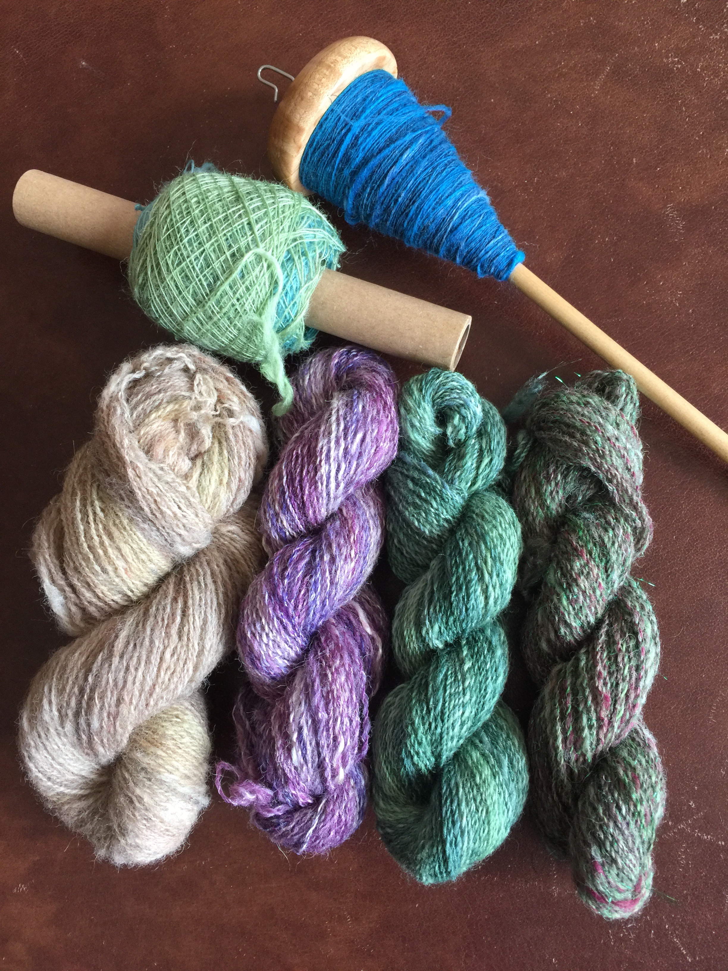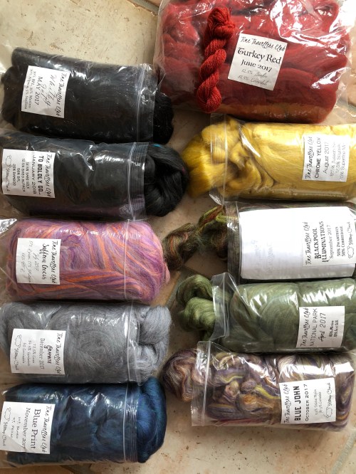 Ich könnte auch ohne bestimmtes Ziel einfach so vor mich hinspinnen und eine meiner Fasern aus einem Faser-Abo verwenden (das sind jeweils 100g außer dem Turkey Red, das sind 200g – das verspinne ich allerdings mit der Handspindel, 70g davon habe ich schon versponnen). Ich könnte die Faser auswählen, zu der mir am wenigsten einfällt, was ich damit machen möchte – das wäre das Päckchen links oben – eine Mischung aus schwarzem BFL, Merino und Alpaka mit Stellina Glitzer. Was könnte ich damit machen? Handstulpen stricken, als Teil von Beinstulpen, als Beilaufgarn zu irgend einem Projekt verwenden, verweben, als Teil eines Tuches verstricken…..?